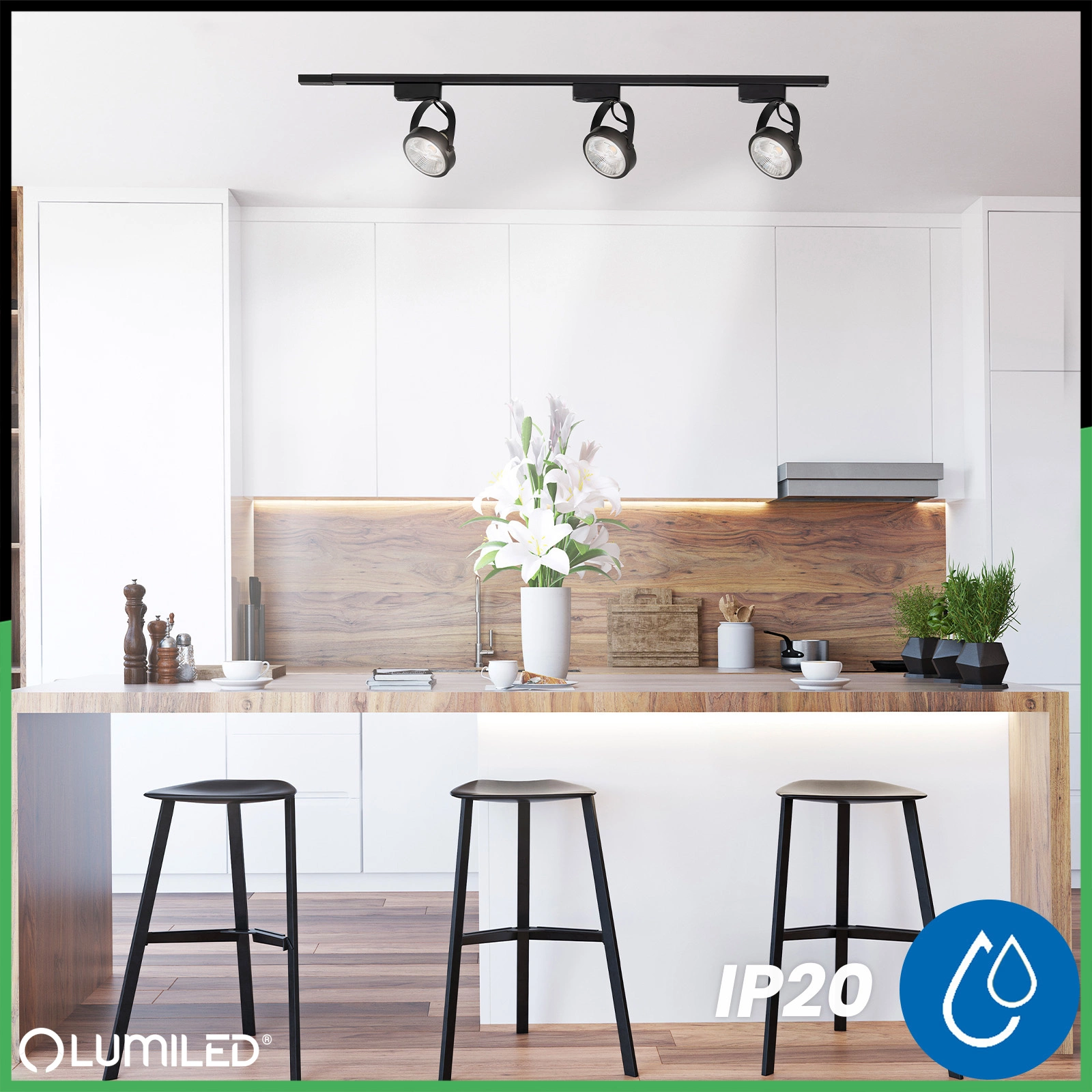 Bausatz: Lichtleiste 1,5m + Drei Stromschienenstrahler in schwarz, aus hochwertiger aluminiumlegierung der bekannten und renommierten Beleuchtungsmarke Lumiled®, ist eine Kombination aus Minimalismus und Funktionalität, die in jedem Raum funktioniert.