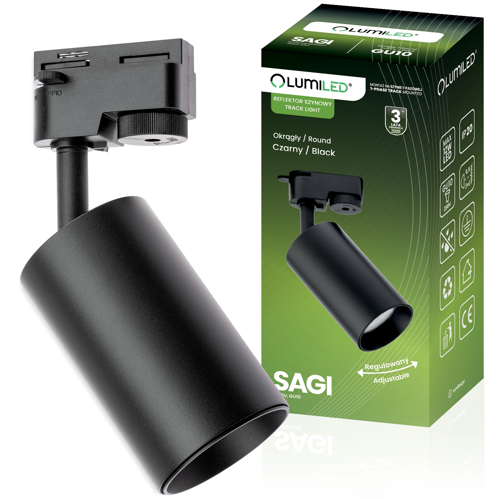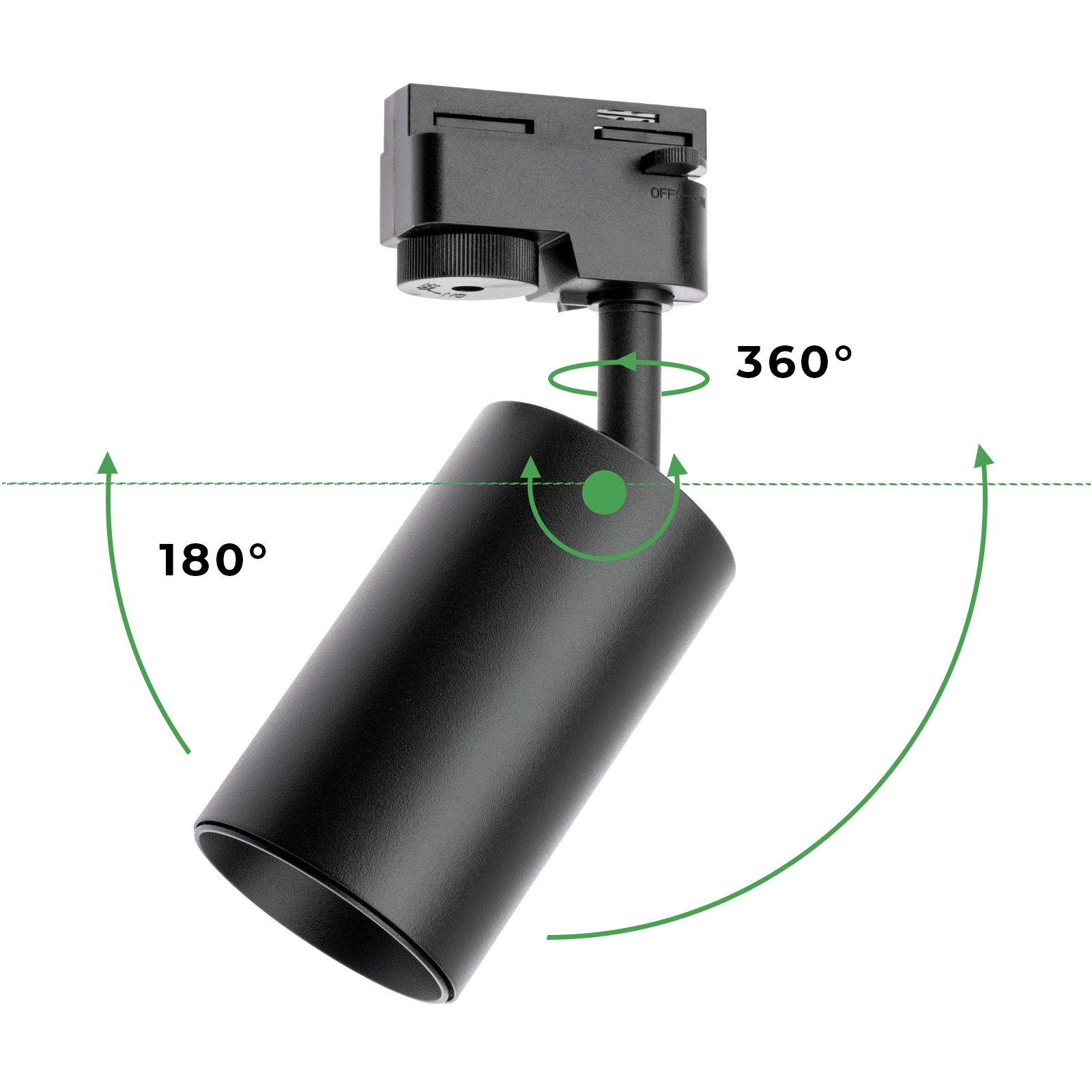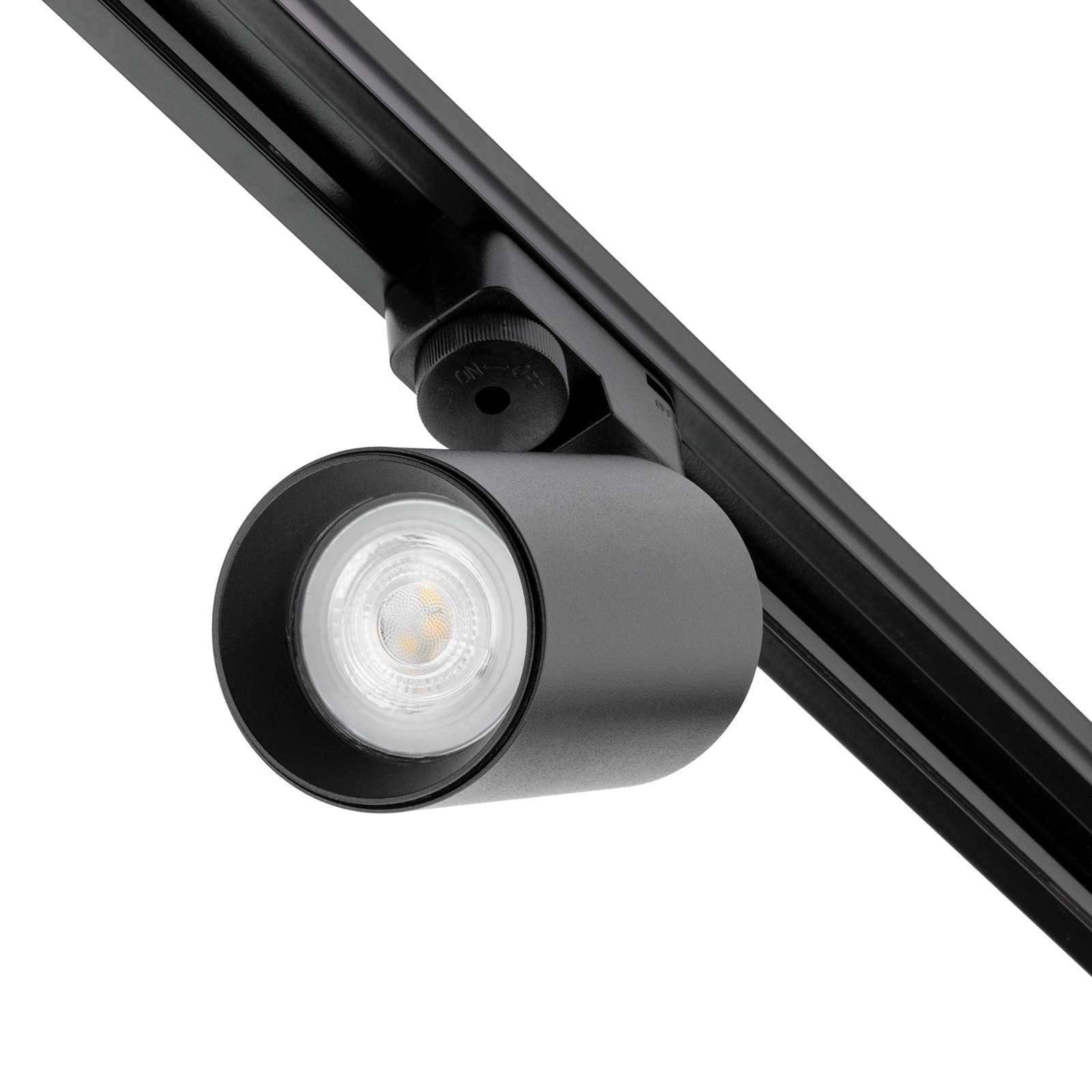 Schienenmontierter Strahler in Schwarz aus hochwertiger Aluminiumlegierung. Die Leuchte ist für die Schienenmontage vorgesehen, mit der Möglichkeit, jede Glühbirne mit GU10-Gewinde mit einer maximalen Leistung von nicht mehr als 35W zu montieren. Die Leuchte wird an einphasigen Stromschienen betrieben. Dank der Verwendung von Stromschienen können wir die Beleuchtung im Raum nach unseren aktuellen Vorlieben steuern.