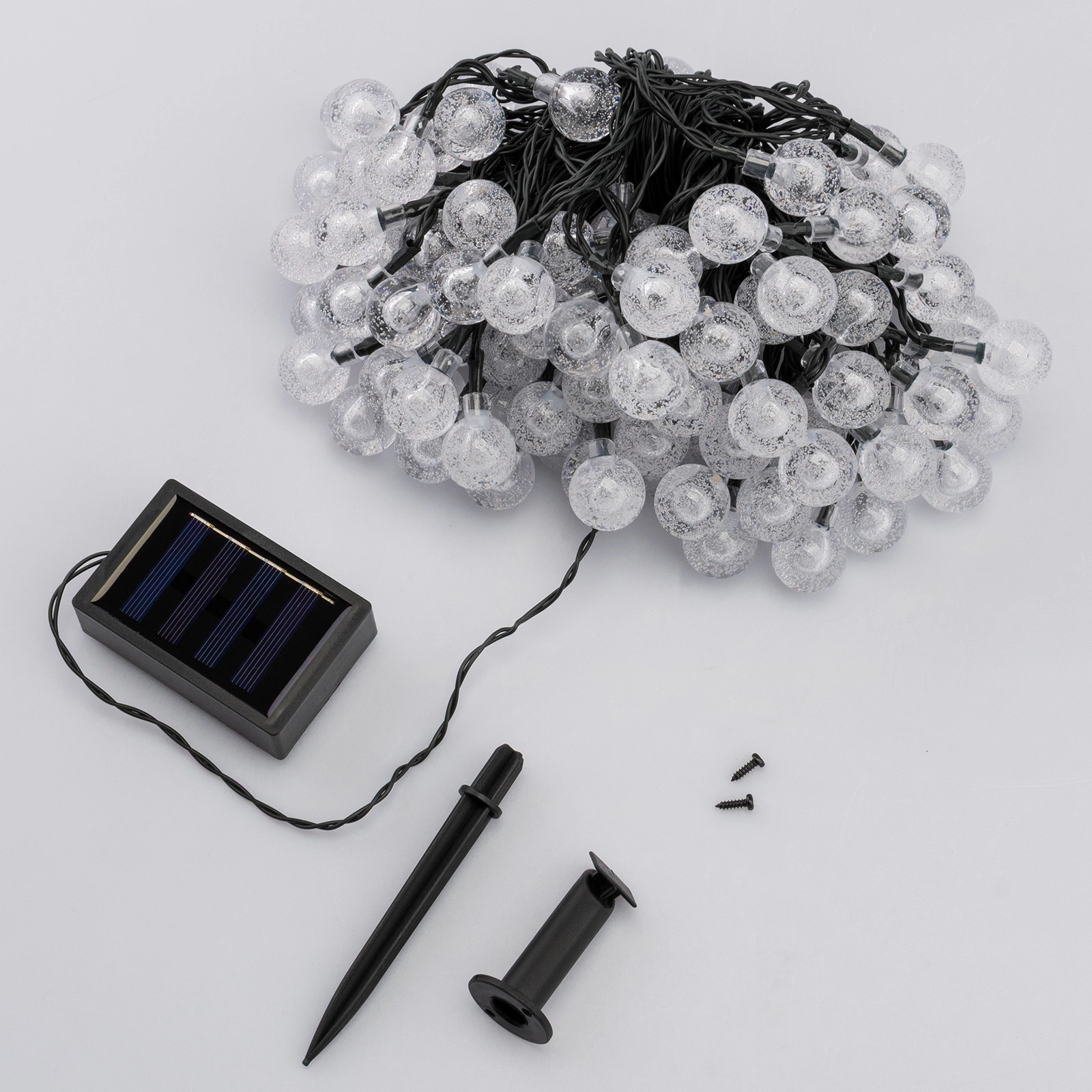 Die GALLA2 Solargirlande der bekannten und renommierten Beleuchtungsmarke Lumiled ermöglicht es Ihnen, eine einzigartige Atmosphäre in Ihrem Garten, auf Ihrer Terrasse oder Ihrem Balkon zu schaffen. Es handelt sich um eine einzigartige Lichtdekoration, die Eleganz, Energieeinsparung und Zweckmäßigkeit perfekt kombiniert, um eine warme und gemütliche Aura in jeder Umgebung zu schaffen. Die Girlande besteht aus 100 transparenten Acrylkugeln mit einem Durchmesser von 2,3 cm, in denen sich jeweils eine warmweiße LED befindet. Sie strahlen ein weiches, stimmungsvolles Licht aus, das sich perfekt als Gartendekoration eignet.