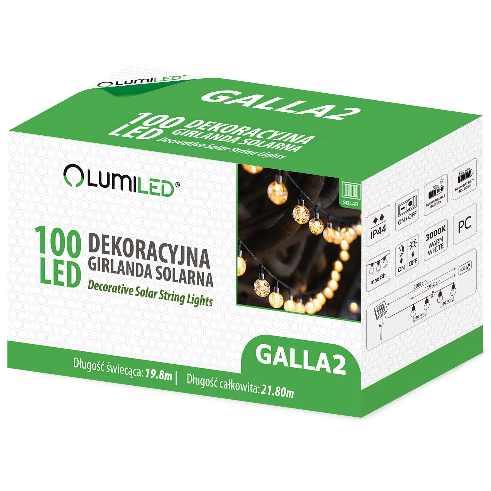 100x LED Solar Lichterkette, Außen Garten Lichterkette 21.8m 3000K warm GALLA2 LUMILED