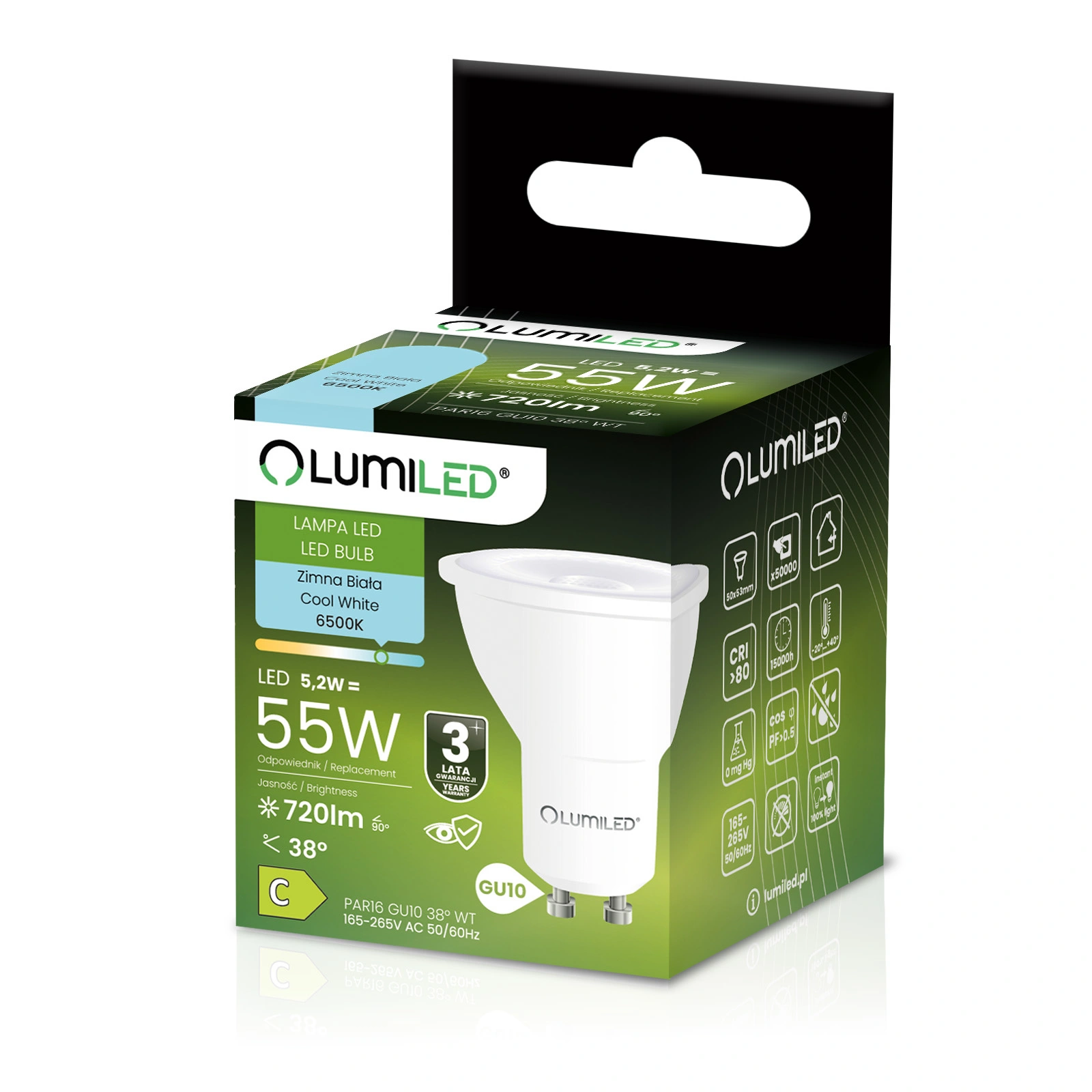 Das 10x GU10 5.2W LED-Glühbirnen-Set von Lumiled ist die ideale Wahl für alle, die eine klare, präzise Beleuchtung benötigen und dabei energieeffizient bleiben wollen. Sie strahlt eine kalte Farbe von 6500K aus und bietet ein starkes, klares Licht, das ideal für Badezimmer, Garagen, Arbeitsräume und Bereiche ist, die maximale Sichtbarkeit erfordern. Der Lichtstrom von 720 lm entspricht dem einer herkömmlichen 55-W-Glühbirne und sorgt für helles, klares Licht ohne Flackern. Mit einem fokussierten Abstrahlwinkel von 38° leuchtet der Strahler ausgewählte Bereiche präzise aus, hebt Details hervor und setzt markante Lichtakzente. Eine gute Wahl, wenn es auf Funktionalität und maximale Sichtbarkeit ankommt.