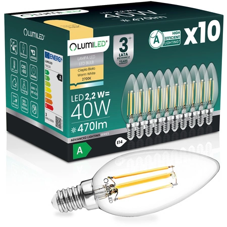 Das Lumiled Set mit 10 B35 LED-Lampen der Energieklasse A ist die richtige Wahl für alle, die höchste Effizienz erwarten. Die Klasse A ist die absolute Spitze der LED-Technologie - die Lichtquelle verbraucht extrem wenig Energie und bietet dennoch volle 470 lm, was einer klassischen 40W-Glühbirne entspricht. Der Unterschied ist schon bei der ersten Verwendung spürbar: Starkes, gleichmäßiges Licht bei minimalem Stromverbrauch bedeutet real niedrigere Rechnungen und einen bewussteren Umgang mit der Beleuchtung. Die warme Farbe von 2700K schafft eine angenehme, stimmungsvolle Atmosphäre, während die Glühfadenform und der 360°-Lichtwinkel den Raum mit einem eleganten, harmonischen Lichtschein erfüllen. Eine Kombination aus Stil, Wirtschaftlichkeit und Qualität, die in dieser Energieklasse einfach den Unterschied macht.