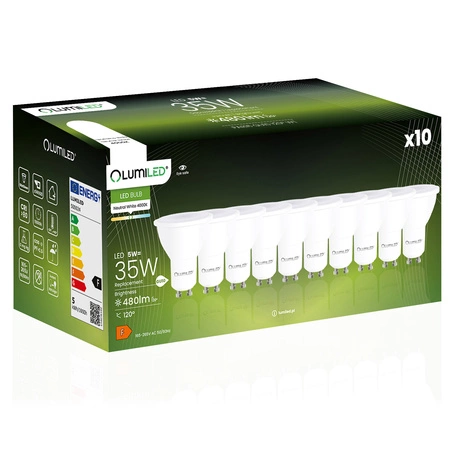 Dieser Satz von 10x LED-Glühbirnen der renommierten Marke LUMILED mit GU10-Sockel und 5W ist ein hervorragender Ersatz für herkömmliche 35W-Glühbirnen und bietet Energieeinsparungen und eine längere Lebensdauer. Sie emittiert Licht mit einem Lichtstrom von 480 Lumen und einer neutralen Farbe von 4000K, was sie ideal für die Innenbeleuchtung macht, wo eine helle und natürliche Lichtfarbe erforderlich ist. Der Abstrahlwinkel von 120° ermöglicht eine breite Streuung des Lichts und leuchtet den Raum effektiv aus. Dank ihrer hochwertigen Verarbeitung hat sie eine Lebensdauer von bis zu 15.000 Stunden, was einer langjährigen Nutzung entspricht. Außerdem arbeitet sie in einem weiten Spannungsbereich von 165-265 V und ist für den Einsatz bei Umgebungstemperaturen von -20°C bis +40°C geeignet. Eine ideale Wahl für alle, die Wert auf Energieeinsparung und Umweltschutz legen.