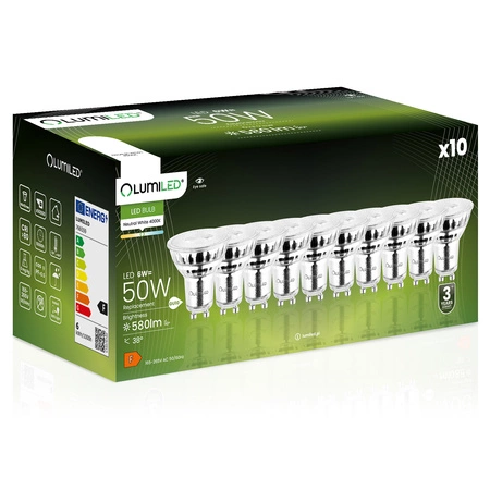 Das 10-fache LED-Glühbirnenset der renommierten Marke LUMILED mit GU10-Sockel und 6W ist ein hervorragender Ersatz für herkömmliche 50W-Glühbirnen und bietet Energieeinsparungen und eine längere Lebensdauer. Sie strahlt Licht mit einem Lichtstrom von 580 Lumen und einer neutralen Farbe von 4000K aus und ist damit ideal für die Innenbeleuchtung, wo eine helle und natürliche Lichtfarbe gewünscht wird. Der Abstrahlwinkel von 38° ermöglicht eine enge Streuung des Lichts, wodurch die zu beleuchtenden Objekte wirkungsvoll akzentuiert werden. Dank ihrer hohen Verarbeitungsqualität hat sie eine Lebensdauer von bis zu 15.000 Stunden, was einer langjährigen Nutzung entspricht. Darüber hinaus arbeitet es in einem weiten Spannungsbereich von 165-265 V und ist für den Einsatz bei Umgebungstemperaturen von -20°C bis +40°C geeignet. Eine ideale Wahl für alle, die Wert auf Energieeinsparung und Umweltschutz legen.