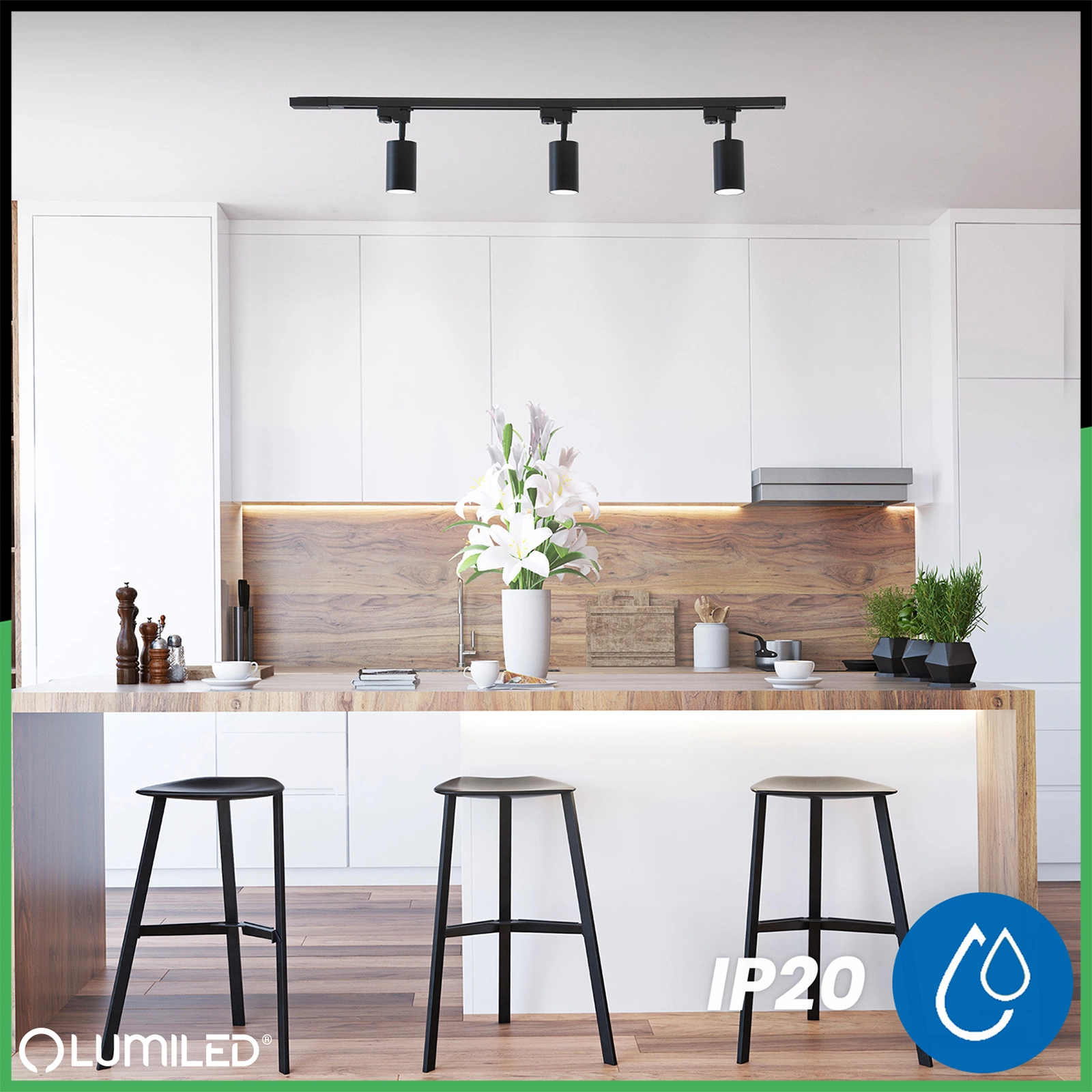Set, Lichtleiste 1m + drei Schienenstrahler in schwarz, hergestellt aus einer hochwertigen Aluminiumlegierung. Set entworfen für die Oberflächenmontage. Der Vorteil der mitgelieferten Strahler ist, dass jede Glühbirne mit einem Gewinde eingesetzt werden kann GU10 mit einer Höchstleistung von nicht mehr als 30 W. Dank der Schienen können wir die Beleuchtung im Raum nach unseren aktuellen Vorlieben steuern.
