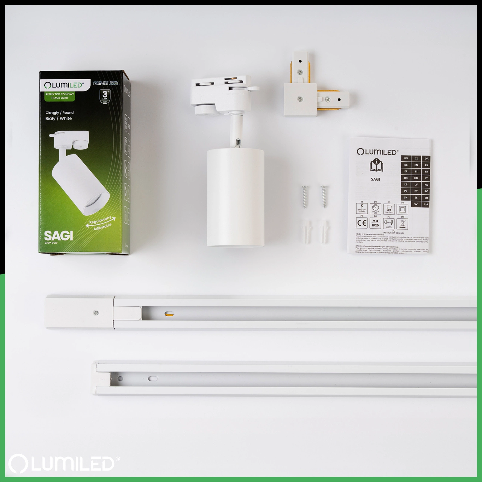 Beleuchtungsschienen-Set, Schiene 2 m + 1 m + 5 x SAGI GU10-Schienenleuchte, weiß, LUMILED + L-Stecker