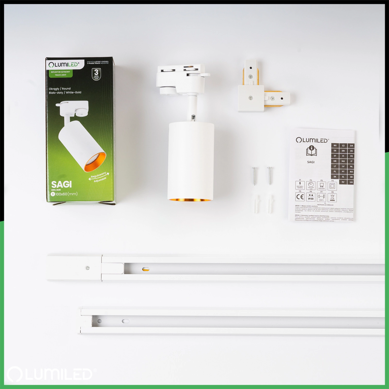 Beleuchtungsschienen-Set, weiße Schiene, 2 m + 1 m + 5 x SAGI GU10-Schienenleuchte, weiß – goldfarben, LUMILED + L-Stecker