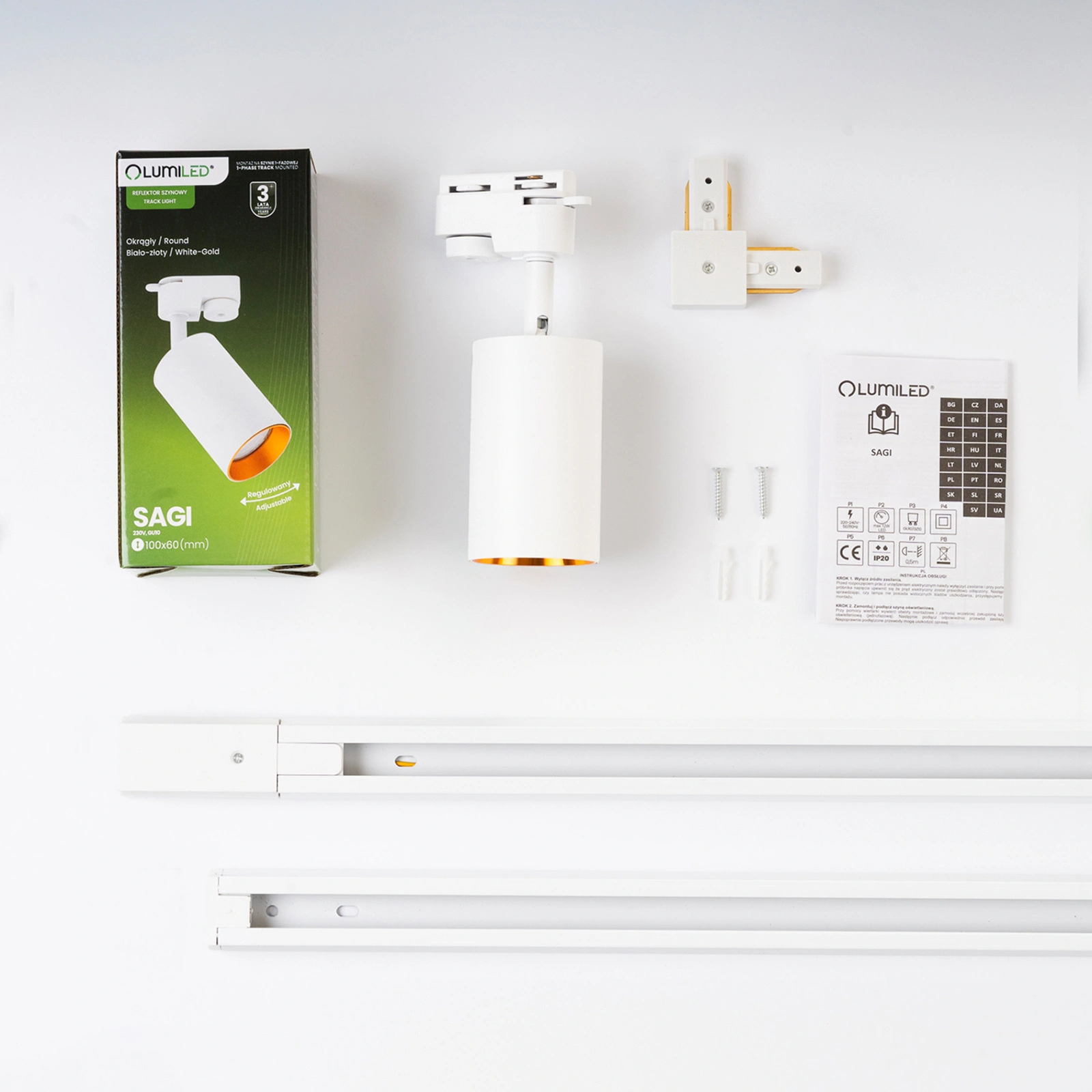 3m Stromschiene Weiß + 5x Schienenstrahler GU10 Weiß-Gold SAGI + L-Verbinder LUMILED