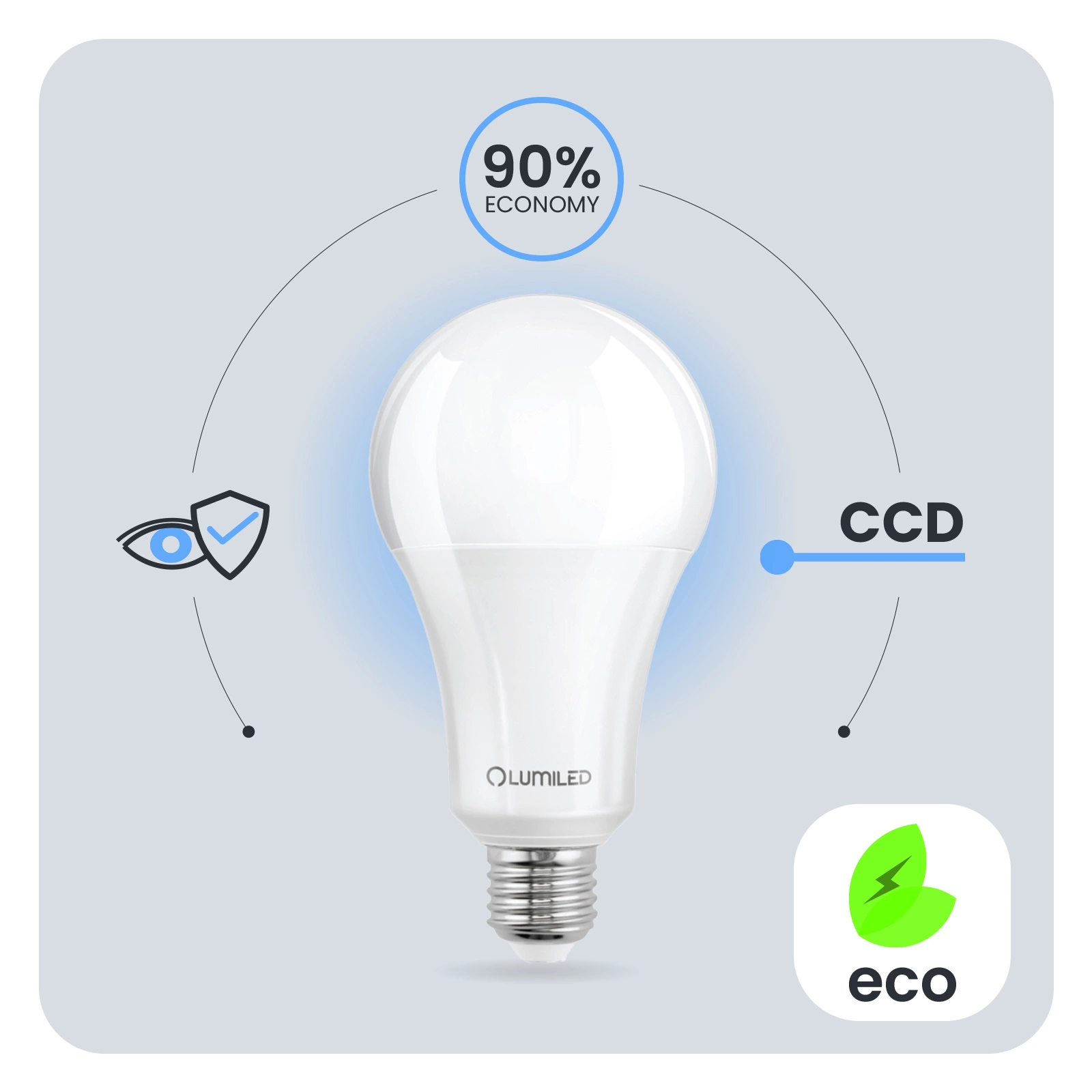 Der in der LED-Glühbirne verwendete CCD-Inverter macht die Glühbirne widerstandsfähig gegen Einbrüche und Spitzen in der Netzspannung. Das Licht flackert und zittert nicht. Der CCD-Konverter sorgt dafür, dass die Glühbirne über einen langen Zeitraum hinweg einwandfrei funktioniert. Bei der Entwicklung der LUMILED-Glühbirnen wurde an den Benutzer gedacht. Eine schlechte Beleuchtungsqualität kann zur Ermüdung der Augen führen. Deshalb verfügen unsere Lampen über die technische Entwicklung Eye Safe, um in jedem Raum eine angenehme und augenfreundliche Beleuchtung zu gewährleisten.