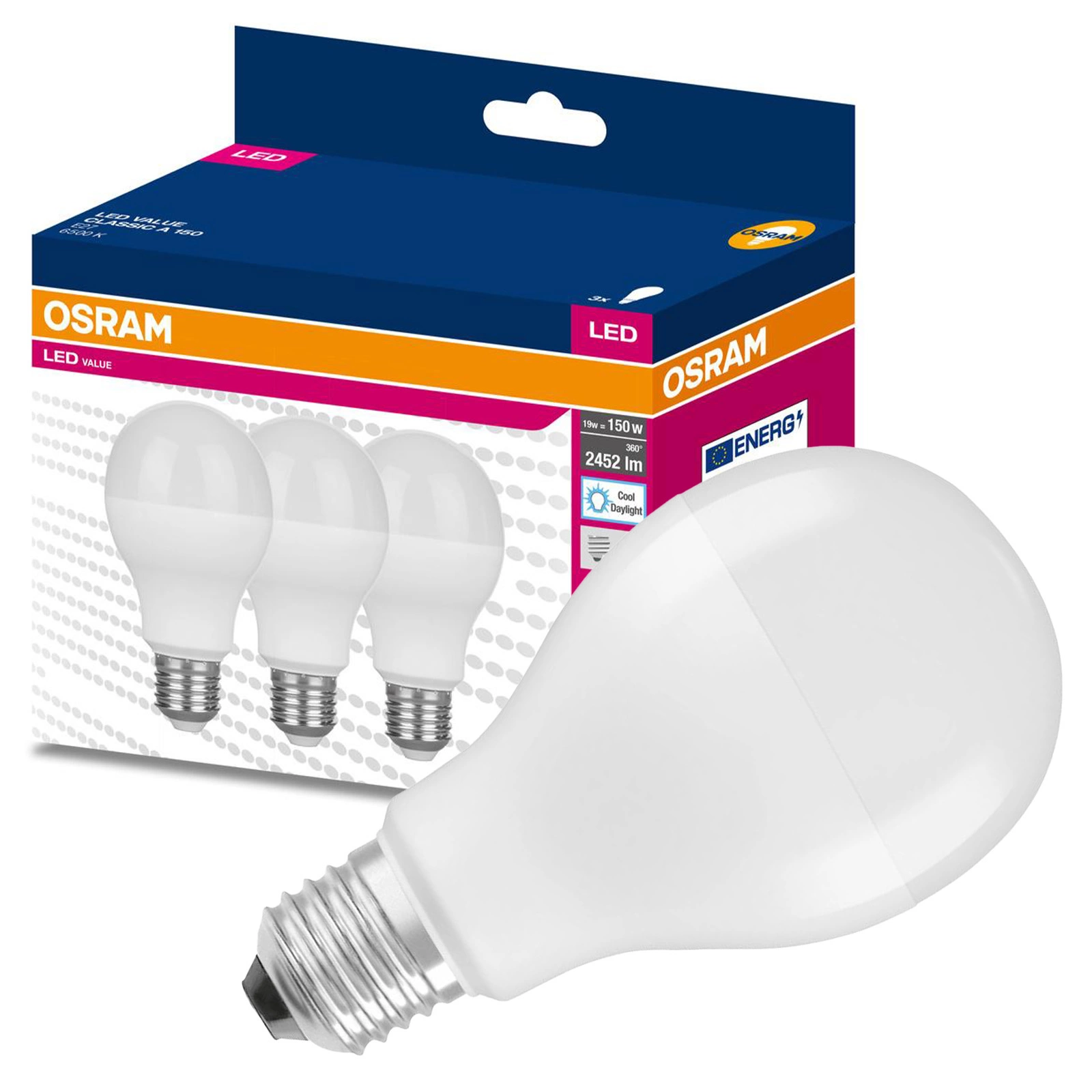 3PAK LED-Lampe E27 A60 19W = 150W 2452lm 6500K Kalt 200° OSRAM VALUE