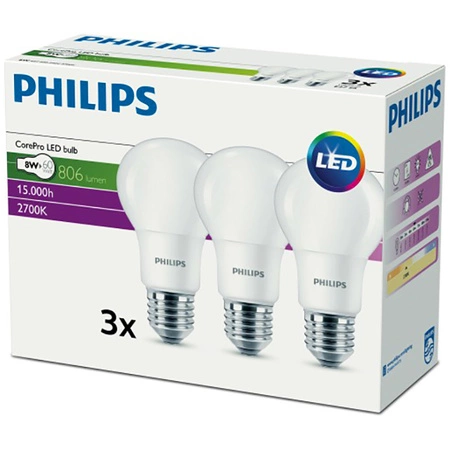 3PAK LED-Glühbirne E27 A60 8W = 60W 806lm 2700K Warm 300° PHILIPS CorePro