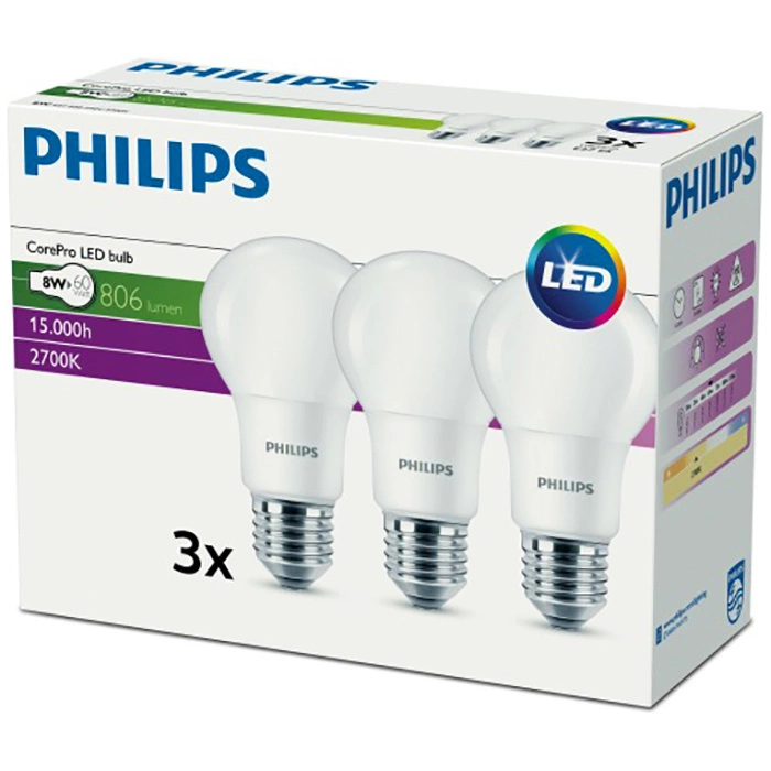 Das Set aus drei LED-Lampen der CorePro- Serie des renommierten und anerkannten Unternehmens Philips mit einem E27- Sockel und einer Leistung von 8 W (entspricht einer herkömmlichen 60-W- Glühbirne ) ist eine hochwertige LED-Lichtquelle. Die Lampe wurde unter Verwendung moderner Lösungen mit innovativer LED-Technologie hergestellt , die sich durch eine hohe Effizienz der Beleuchtungsparameter auszeichnen.