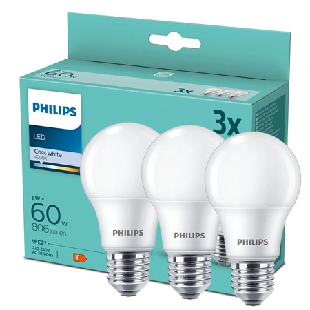 Im Set sind 3x E27 LED-Leuchtmittel von PHILIPS enthalten .