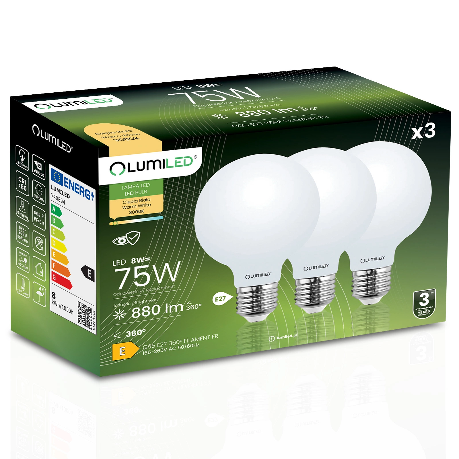 Dieses Set aus 3x LED-Glühbirnen der renommierten Marke LUMILED mit E27-Sockel und 8W ist ein hervorragender Ersatz für herkömmliche 75W-Glühbirnen und bietet Energieeinsparungen und eine längere Lebensdauer. Sie gibt Licht mit einem Lichtstrom von 880 Lumen und einer warmen Lichtfarbe von 3000K ab und ist somit ideal für die Innenbeleuchtung, wo eine weiche und angenehme Lichtfarbe gewünscht wird. Der Ausstrahlungswinkel von 360° ermöglicht eine breite Lichtstreuung und leuchtet den Raum effektiv aus. Dank ihrer hochwertigen Verarbeitung hat sie eine Lebensdauer von bis zu 15.000 Stunden, was einer langjährigen Nutzung entspricht. Zudem arbeitet sie in einem weiten Spannungsbereich von 165-265 V und ist für den Einsatz bei Umgebungstemperaturen von -20°C bis +40°C geeignet. Eine ideale Wahl für alle, die Wert auf Energieeinsparung und Umweltschutz legen.