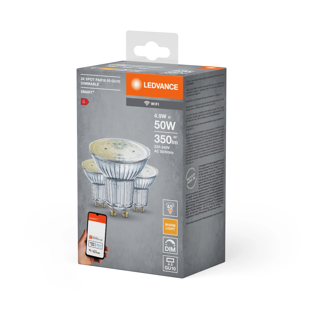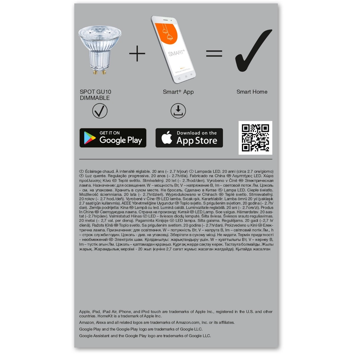 Die moderne GU10 SMART+ LED-Glühlampe verbindet fortschrittliche Technologie mit Lichtkomfort. Sie bietet einen Lichtstrom von 350 lm bei einer Nennleistung von 4,9W, was einer Lichtausbeute von 72 lm/W entspricht. Mit einer warmen Lichtfarbe von 2700K schafft sie ein gemütliches Ambiente, ideal für Wohnräume.