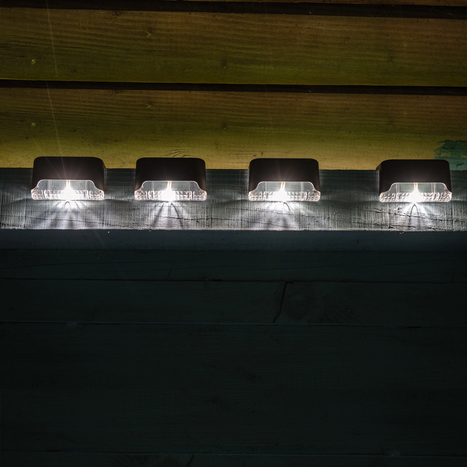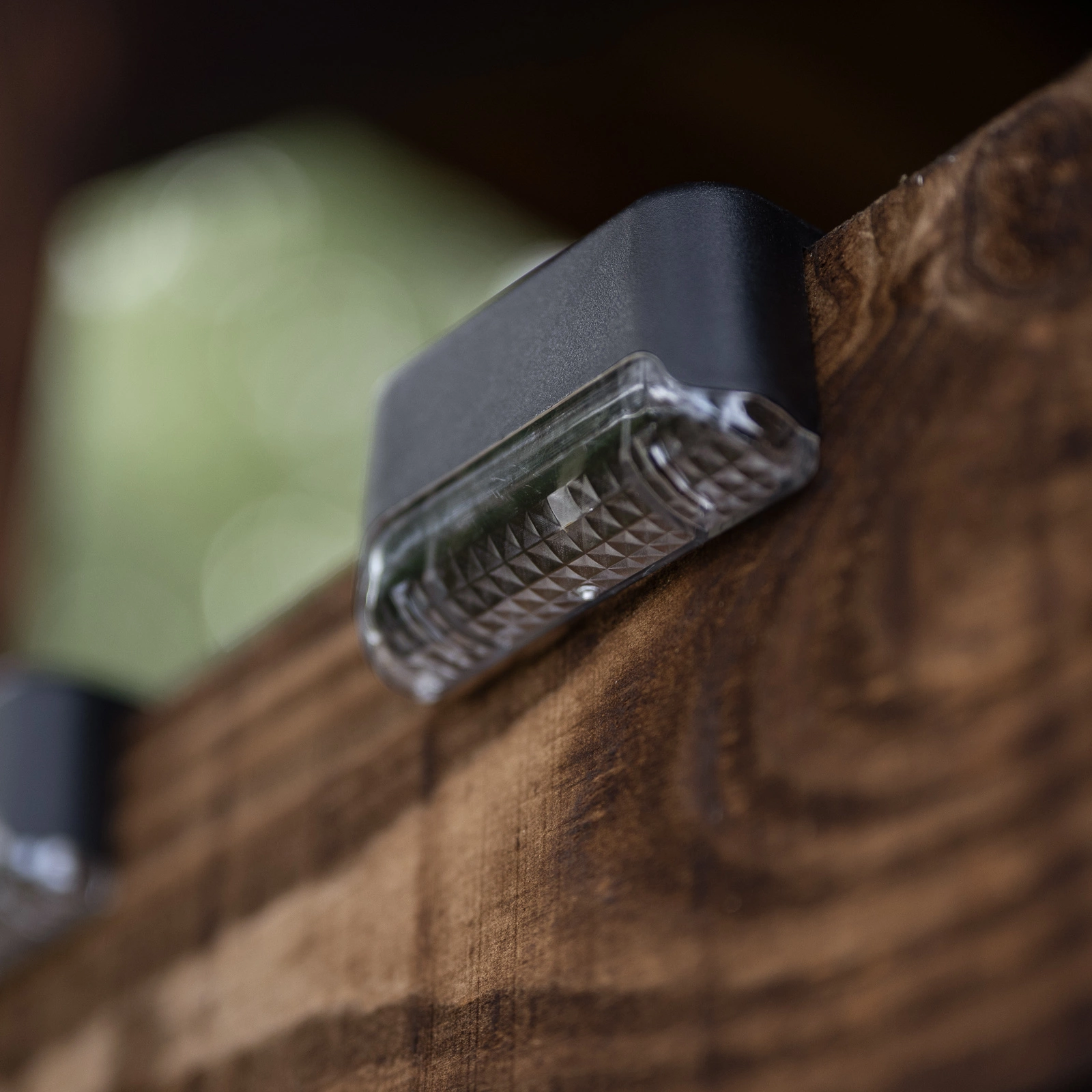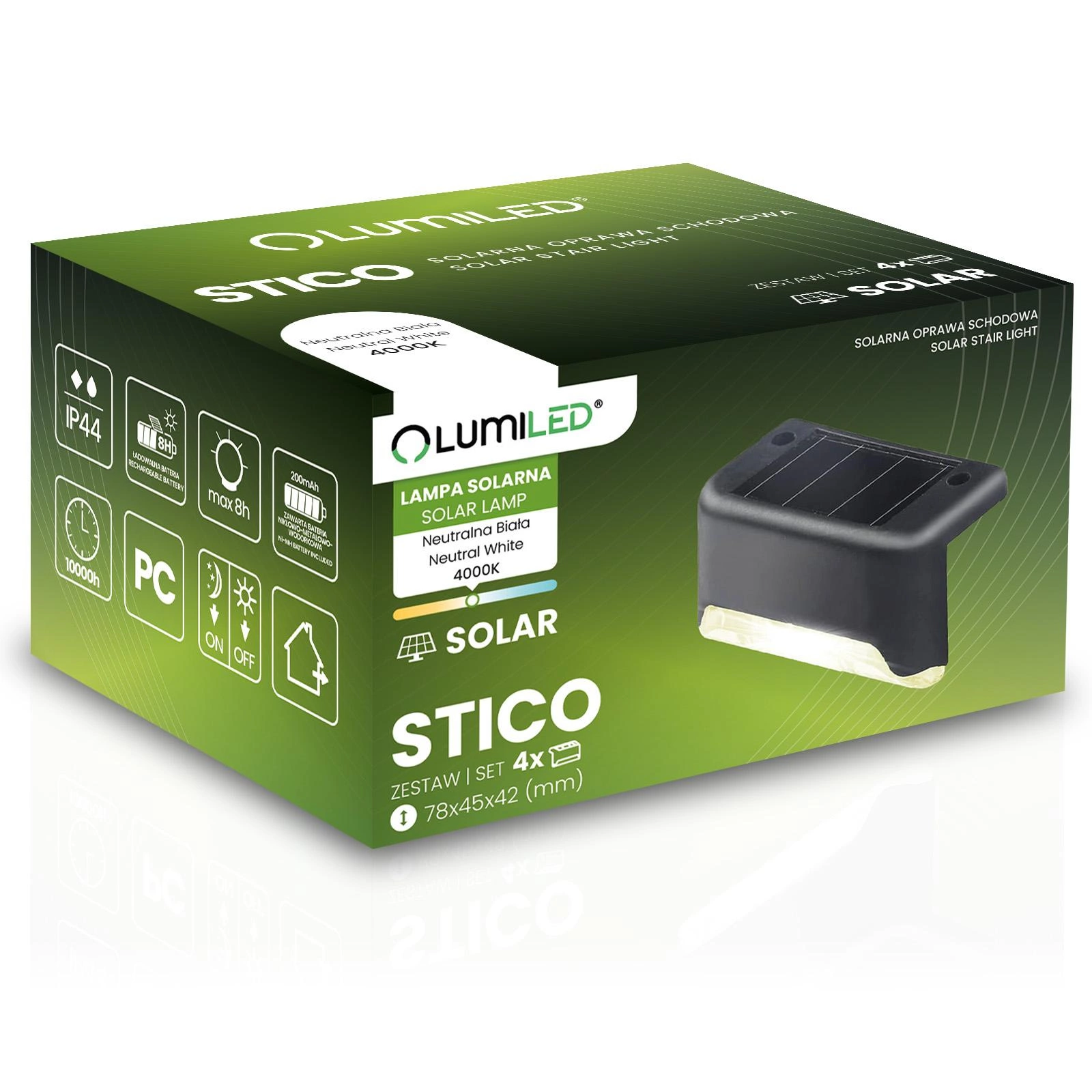 Ein Satz von 4 Solarlampen in Schwarz aus der STICO-Serie der bekannten und renommierten Beleuchtungsmarke LUMILED bietet eine moderne und ökologische Beleuchtungslösung für Ihren Garten. Ihre robuste Konstruktion sorgt für Langlebigkeit, während das einzigartige Design dem Raum, in dem sie platziert wird, Eleganz verleiht. Sie ist nicht nur eine praktische Lichtquelle, sondern auch ein stilvolles und originelles dekoratives Accessoire, das den Charme eines jeden Gartens unterstreicht. Die kompakten Abmessungen der Leuchte ermöglichen eine einfache Montage auf verschiedenen Oberflächen von Treppen oder Balustraden.