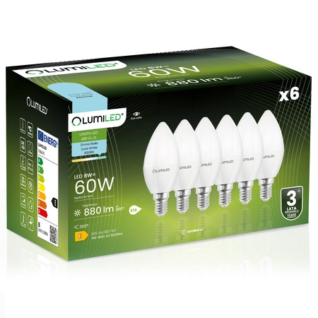 DiesesSet aus 6 Lumiled LED-Lampen mit 8W und 6500K Farbe ist eine Kombination aus hoher Leistung und Energieeffizienz. Mit einer Lichtausbeute von bis zu 880 Lumen bietet sie ein Licht, das mit dem einer herkömmlichen 60-Watt-Glühbirne vergleichbar ist, während sie gleichzeitig den Stromverbrauch deutlich reduziert. Dank ihrer geringen Größe und des E14-Gewindes eignet sie sich ideal für Wandleuchter, Lampen und Vorrichtungen mit begrenztem Platzangebot. Sie ist eine praktische Wahl für Räume, in denen Sie eine klare, aber ansprechende Beleuchtung benötigen.