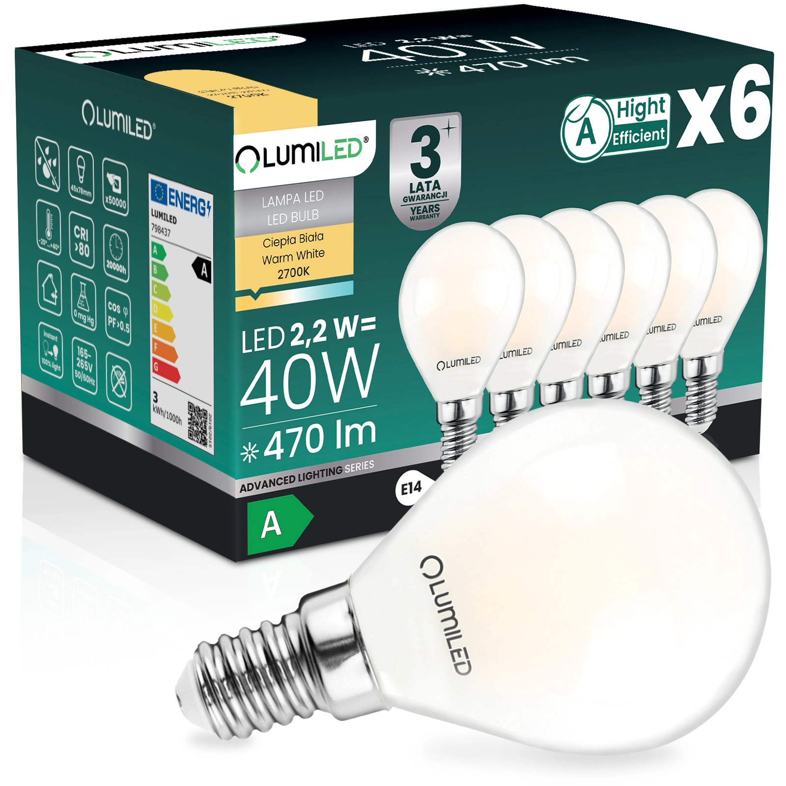 6x LED-Lampe E14 Kugel P45 2,2W 470lm = 40W 2700K warmweiß 360° Filament Energieklasse A LUMILED