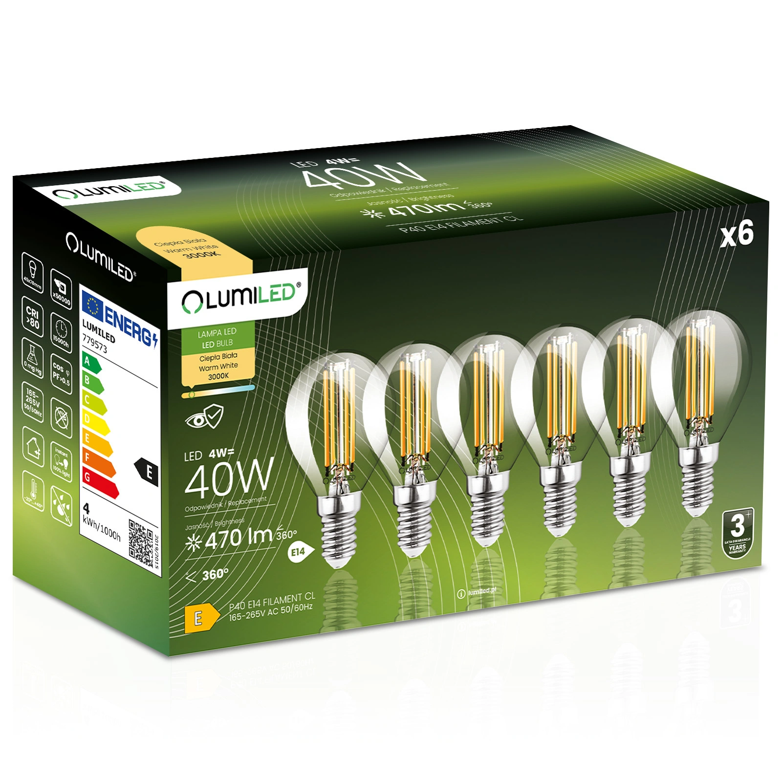 Das 6x LUMILED LED-Glühbirnen-Set mit E14-Gewinde und 4W Leistung ist ein energiesparender 40W-Ersatz. Sie strahlt 470 Lumen warmes 3000K-Licht aus und schafft eine angenehme Atmosphäre. Der 360°-Winkel sorgt für eine gleichmäßige Lichtverteilung im Raum. Eine Lebensdauer von bis zu 15.000 Stunden und ein Betriebsbereich von 165-265 V garantieren Zuverlässigkeit und lange Lebensdauer. Eine ideale Wahl für alle, die Wert auf Energieeinsparung und Ökologie legen.