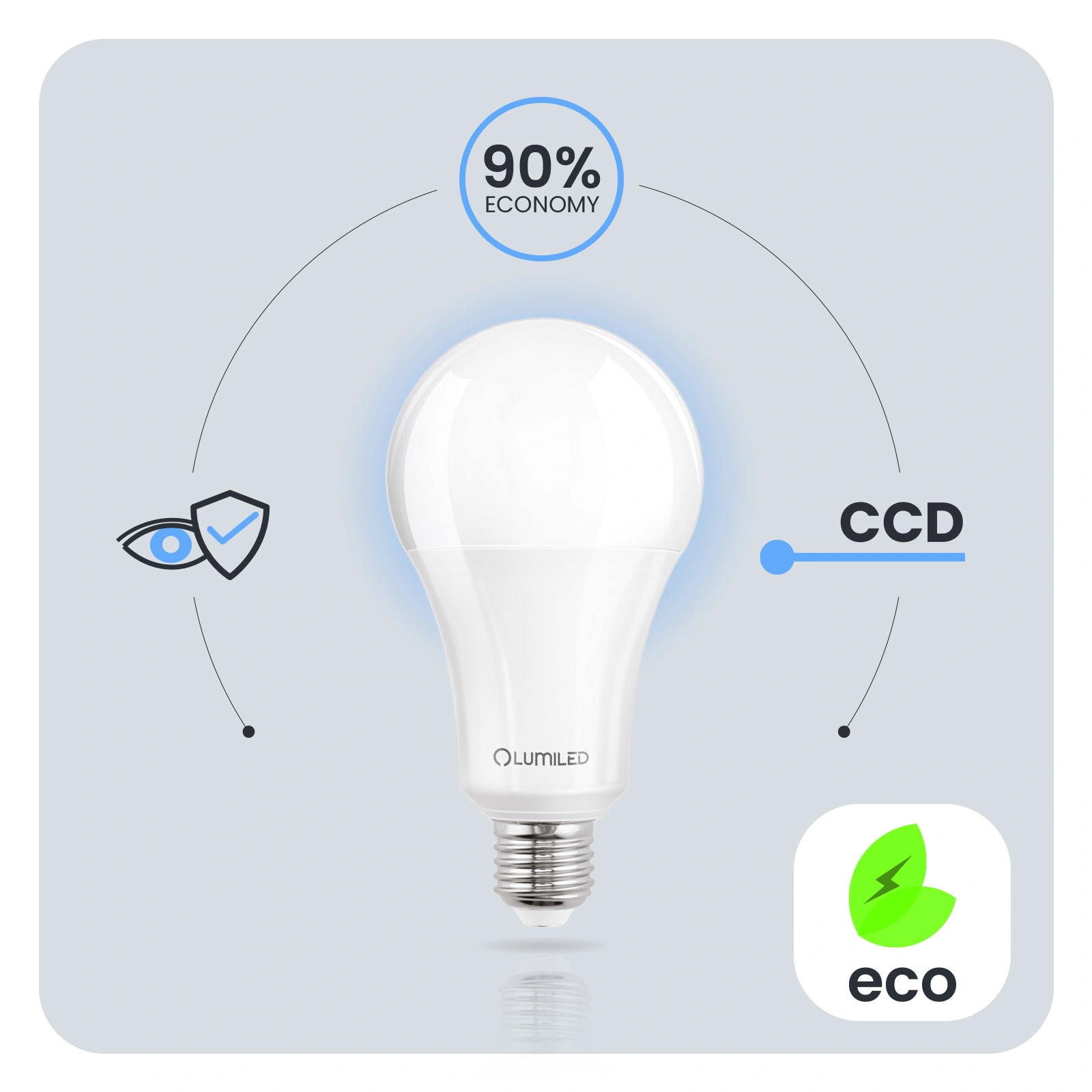 Der in der LED-Glühbirne verwendete CCD-Inverter macht die Glühbirne widerstandsfähig gegen Einbrüche und Spitzen in der Netzspannung. Das Licht flackert und zittert nicht. Der CCD-Konverter sorgt dafür, dass die Glühbirne über einen langen Zeitraum hinweg einwandfrei funktioniert. Bei der Entwicklung der LUMILED-Glühbirnen wurde an den Benutzer gedacht. Eine schlechte Beleuchtungsqualität kann zur Ermüdung der Augen führen. Deshalb verfügen unsere Lampen über die technische Entwicklung Eye Safe, um in jedem Raum eine angenehme und augenfreundliche Beleuchtung zu gewährleisten.