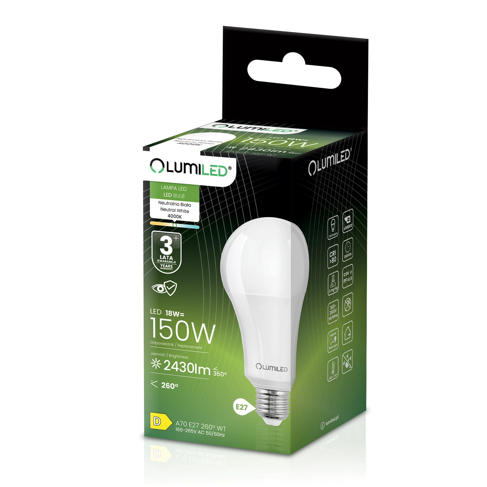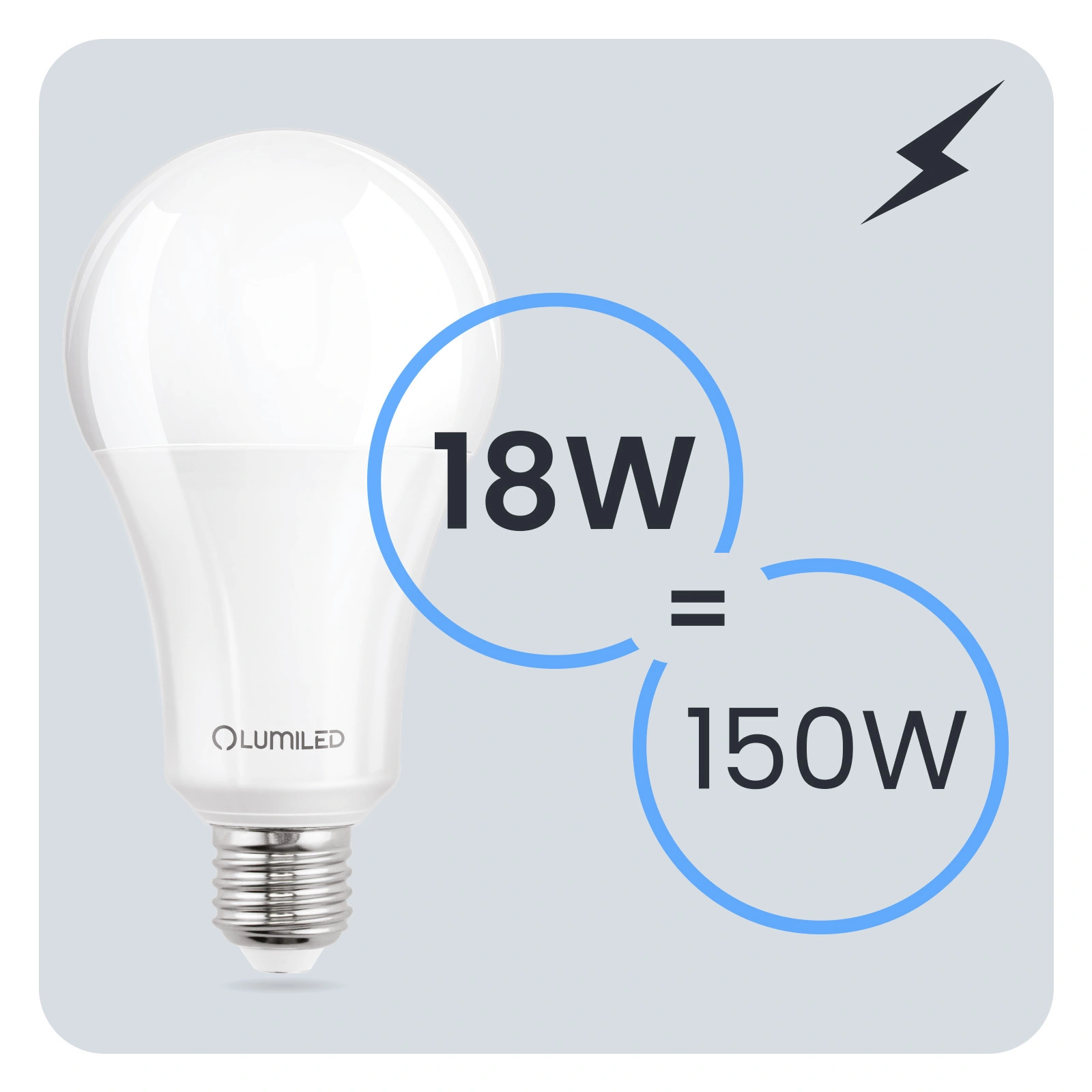 Das Lumiled 6x 18W LED-Glühbirnen-Set ist eine gute Wahl für alle, die eine sehr helle, effiziente Beleuchtung mit geringem Energieverbrauch benötigen. Sie strahlt eine neutrale Farbe von 4000K aus, die Farben originalgetreu wiedergibt und für eine natürliche, angenehme Sicht in jedem Raum sorgt. Dank des Standard-E27-Sockels passt sie problemlos in die meisten Lampen und Leuchten. Der Lichtstrom von 2430 lm bietet ein außergewöhnlich starkes, gleichmäßiges Licht, das mit dem einer herkömmlichen 150-W-Glühlampe vergleichbar ist. Der weite Abstrahlwinkel von 260° leuchtet den gesamten Raum effektiv aus und eliminiert Schatten und dunkle Zonen.