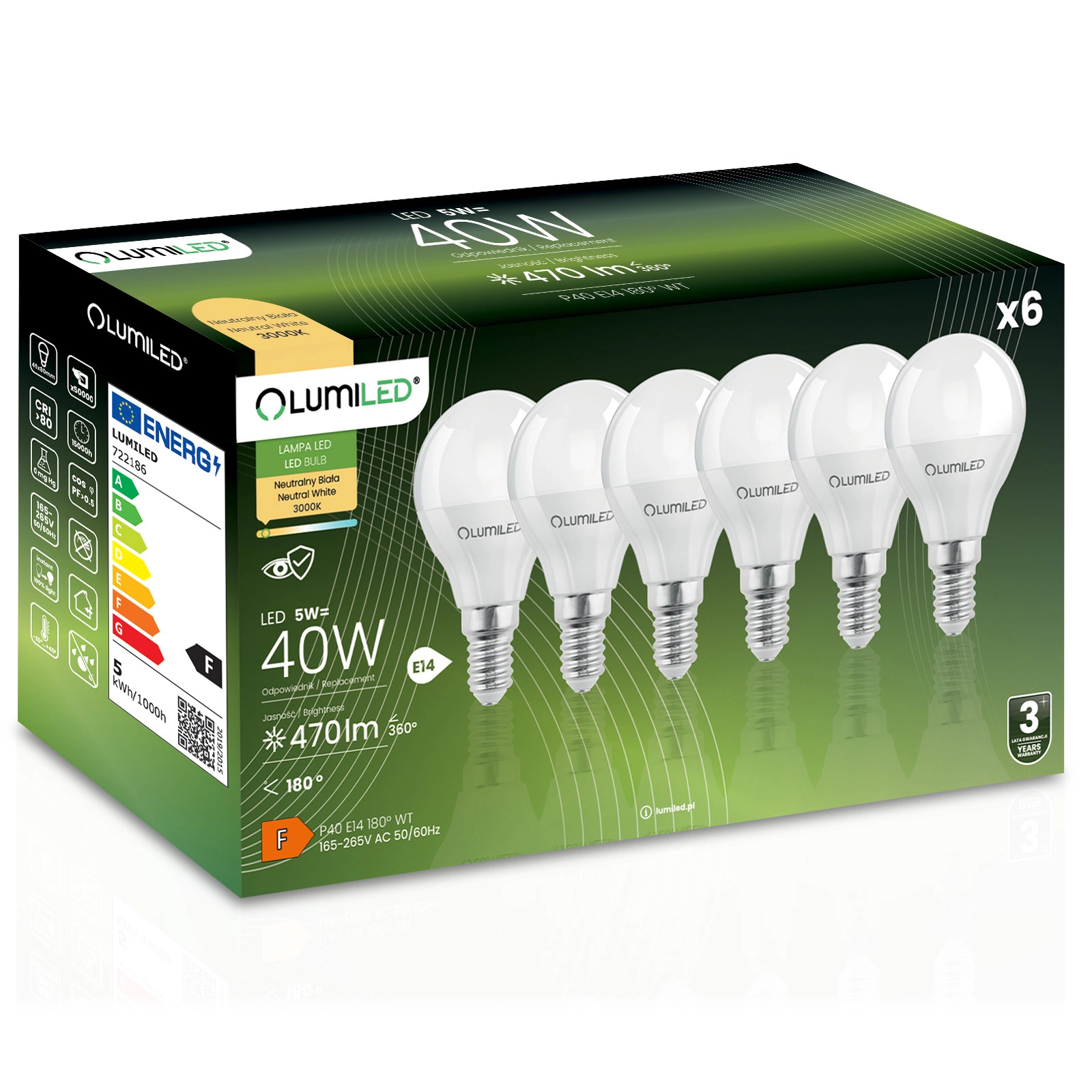 Dieser Satz von 6x LED-Glühbirnen der renommierten Marke LUMILED mit E14-Sockel und 5W ist ein hervorragender Ersatz für herkömmliche 40W-Glühbirnen und bietet Energieeinsparungen und eine längere Lebensdauer. Sie gibt Licht mit einem Lichtstrom von 470 Lumen und einer warmen Lichtfarbe von 3000K ab, was sie ideal für die Innenbeleuchtung macht, wo eine weiche, angenehme Lichtfarbe gewünscht wird. Der Ausstrahlungswinkel von 180° sorgt für eine breite Lichtstreuung und damit für eine gute Ausleuchtung des Raumes. Dank ihrer hochwertigen Verarbeitung hat sie eine Lebensdauer von bis zu 15.000 Stunden, was einer langjährigen Nutzung entspricht. Außerdem arbeitet sie in einem weiten Spannungsbereich von 165-265 V und ist für den Einsatz bei Umgebungstemperaturen von -20°C bis +40°C geeignet. Eine ideale Wahl für alle, die Wert auf Energieeinsparung und Umweltschutz legen.