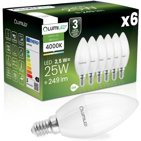 Dieser Satz von 6x LED-Glühbirnen der renommierten Marke LUMILED mit E14-Sockel und 2,5 W ist ein hervorragender Ersatz für herkömmliche 25 W-Glühbirnen und bietet Energieeinsparungen und eine längere Lebensdauer. Sie strahlt Licht mit einem Lichtstrom von 249 Lumen und einer neutralen Farbe von 4000K aus und ist damit ideal für die Innenbeleuchtung, wo eine helle und natürliche Lichtfarbe gewünscht wird. Der Abstrahlwinkel von 180° ermöglicht eine breite Lichtstreuung, die den Raum effektiv ausleuchtet. Dank ihrer hochwertigen Verarbeitung hat sie eine Lebensdauer von bis zu 15.000 Stunden, was einer langjährigen Nutzung entspricht. Außerdem arbeitet sie in einem weiten Spannungsbereich von 165-265 V und ist für den Einsatz bei Umgebungstemperaturen von -20°C bis +40°C geeignet. Eine ideale Wahl für alle, die Wert auf Energieeinsparung und Umweltschutz legen.
