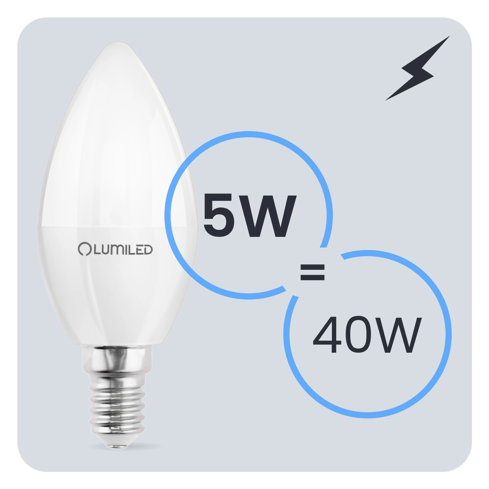 Dieser Satz von 6x LED-Glühbirnen der renommierten Marke LUMILED mit E14-Sockel und 5W ist ein hervorragender Ersatz für herkömmliche 40W-Glühbirnen und bietet Energieeinsparungen und eine längere Lebensdauer. Sie gibt Licht mit einem Lichtstrom von 470 Lumen und einer warmen Lichtfarbe von 3000K ab, was sie ideal für die Innenbeleuchtung macht, wo eine weiche, angenehme Lichtfarbe gewünscht wird. Der Abstrahlwinkel von 180° ermöglicht eine breite Lichtstreuung, die den Raum effektiv ausleuchtet. Dank ihrer hochwertigen Verarbeitung hat sie eine Lebensdauer von bis zu 15.000 Stunden, was einer langjährigen Nutzung entspricht. Zudem arbeitet sie in einem weiten Spannungsbereich von 165-265 V und ist für den Einsatz bei Umgebungstemperaturen von -20°C bis +40°C geeignet. Eine ideale Wahl für alle, die Wert auf Energieeinsparung und Umweltschutz legen.