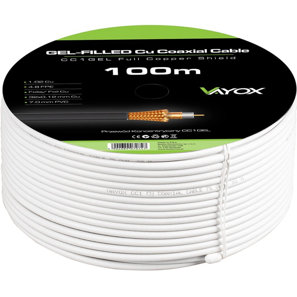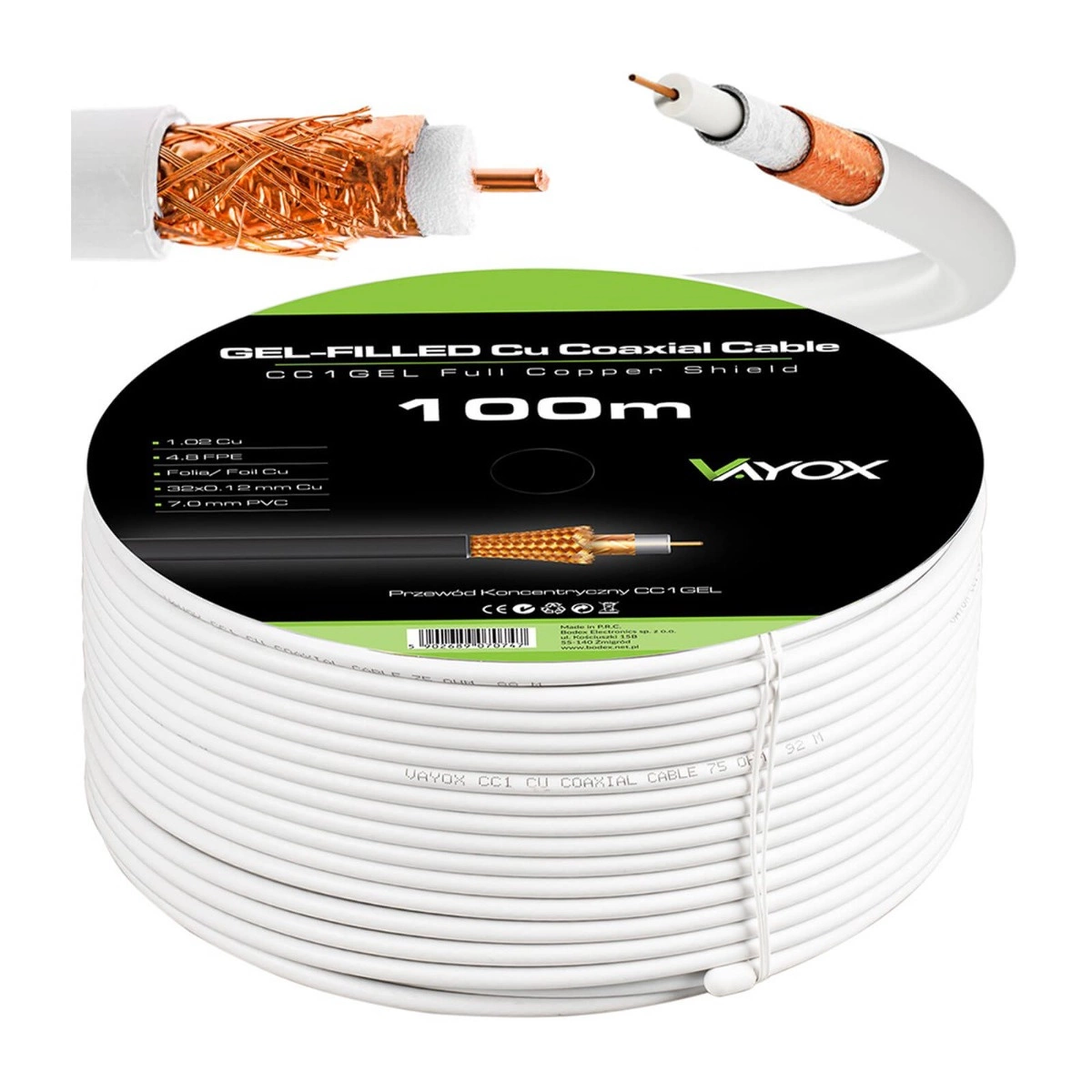 Höchste Qualität der Kabelkonstruktion CC1, großartig signalfluss ohne Störungen, egal wie lange die Installation dauert, sie ist eine zuverlässige wahl für Jahre verwendet. Das Kabel ist ideal für den Empfang von Kanälen in Qualität 4K und Full HD, es kann sowohl für terrestrisches, Satelliten- und Kabelfernsehen. Wirkungsgrad wirkungsgrad der Klasse A und immunität gegen Störungen telefonnetz LTE das unterscheidet das Koaxialkabel von Vayox. Koaxialkabel gelgefüllt mit Kupferleiter mit einer Dicke von 1,02 mm ist geeignet für den Bau von außen und innen antennennetz. Das verwendete Gel schützt das Kabel gegen das Eindringen von feuchtigkeit, und dadurch schützt gehen gegen Leistungseinbußen, damit wir das Kabel verlegen können in den Boden. Die äußere Isolierung ist hoch widerstandsfähig für jegliche Schäden schaden und das Kabel ist extrem flexibel flexibel, sie können es leicht an die Bedürfnisse Ihrer Anlage anpassen.