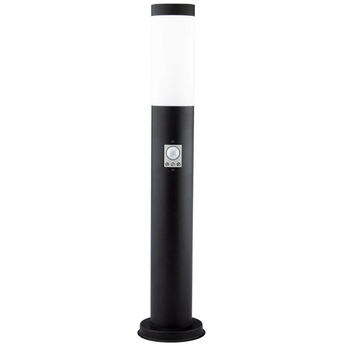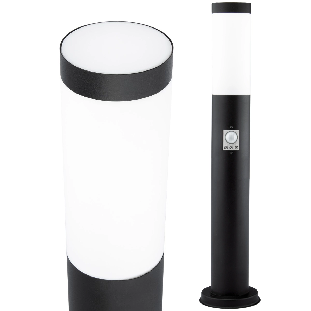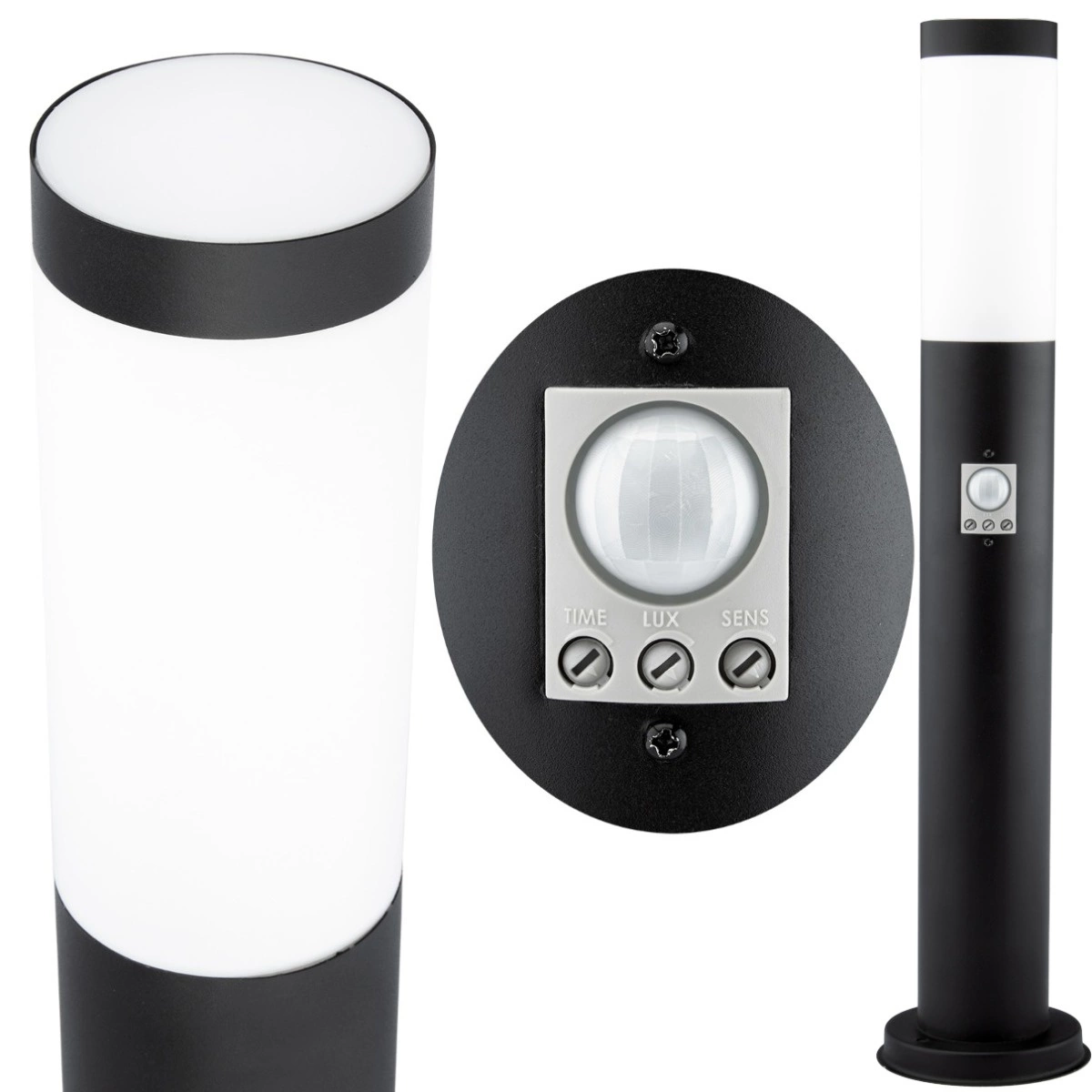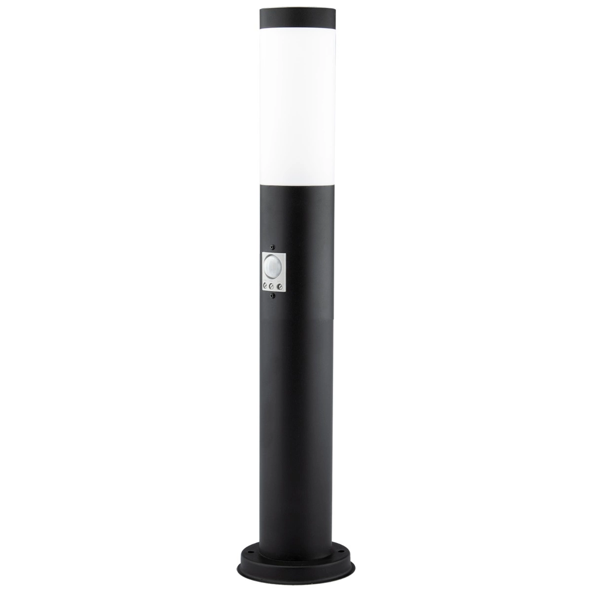 Gartenlampe, Außenmast, 45 cm hoch , schwarz mit integriertem Bewegungs- und Dämmerungssensor. Die Lampe besteht aus hochwertigem Edelstahl und Kunststoff. Durch die Verwendung von Edelstahl ist die Lampe langlebig, leicht zu reinigen und optisch ansprechend. Die Lampe wurde mit Blick auf ihre Benutzer entwickelt, sie verwendet die beliebte E27- Fassung – so können Sie jede Glühbirne mit diesem Gewinde einschrauben und ihre Leistung überschreitet im Falle einer LED-Glühbirne 20 W nicht.