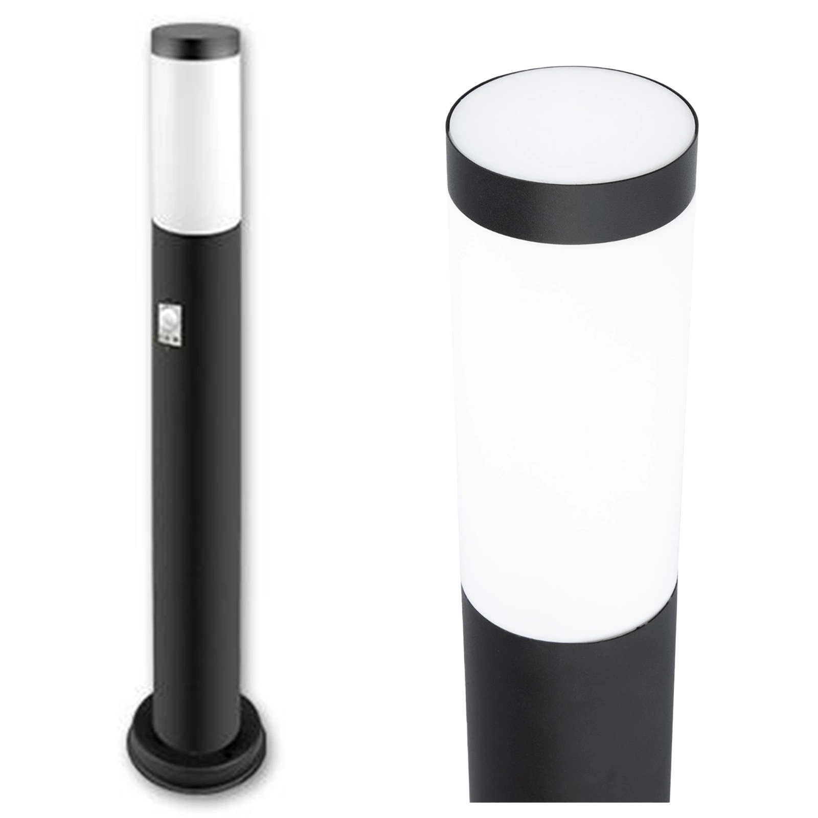 Gartenlampe, Außenmast, 65 cm hoch , schwarz mit integriertem Bewegungs- und Dämmerungssensor. Die Lampe besteht aus hochwertigem Edelstahl und Kunststoff. Durch die Verwendung von Edelstahl ist die Lampe langlebig, leicht zu reinigen und optisch ansprechend. Die Lampe wurde mit Blick auf ihre Benutzer entwickelt, sie verwendet die beliebte E27- Fassung – so können Sie jede Glühbirne mit diesem Gewinde einschrauben und ihre Leistung überschreitet im Falle einer LED-Glühbirne 20 W nicht.