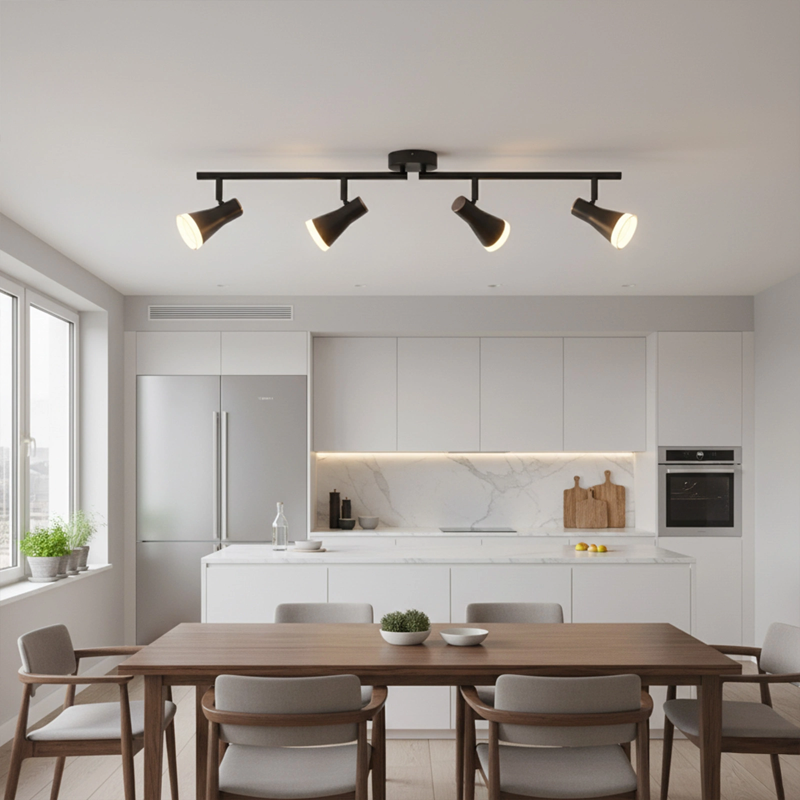 - Esszimmer – Lampen über dem Tisch sind eine interessante Dekoration, die Hauptaufgabe besteht darin, den Tisch perfekt auszuleuchten.