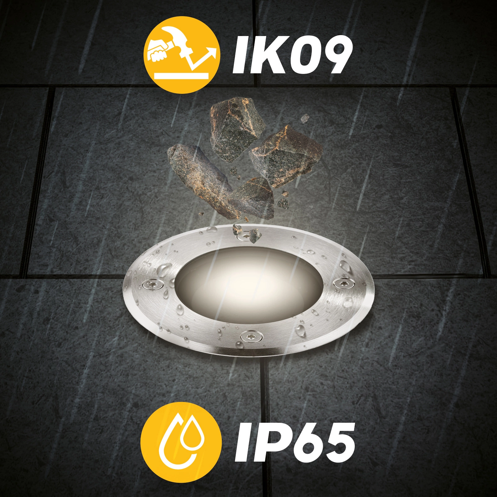 - Gehäuse, das eine dauerhafte Einbettung der Leuchte in den Boden ermöglicht