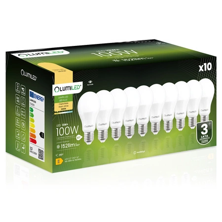 Dieses Set von 10x LED-Glühbirnen der renommierten Marke LUMILED mit E27-Sockel und 13W ist ein hervorragender Ersatz für herkömmliche 100W-Glühbirnen und bietet Energieeinsparungen und eine längere Lebensdauer. Sie gibt Licht mit einem Lichtstrom von 1521 Lumen und einer warmen Lichtfarbe von 3000K ab und ist damit ideal für die Innenbeleuchtung, wo eine weiche und angenehme Lichtfarbe gewünscht wird. Der Abstrahlwinkel von 260° ermöglicht eine breite Lichtstreuung und eine effektive Ausleuchtung des Raumes. Dank ihrer hochwertigen Verarbeitung hat sie eine Lebensdauer von bis zu 15.000 Stunden, was einer langjährigen Nutzung entspricht. Zudem arbeitet sie in einem weiten Spannungsbereich von 165-265 V und ist für den Einsatz bei Umgebungstemperaturen von -20°C bis +40°C geeignet. Eine ideale Wahl für alle, die Wert auf Energieeinsparung und Umweltschutz legen.