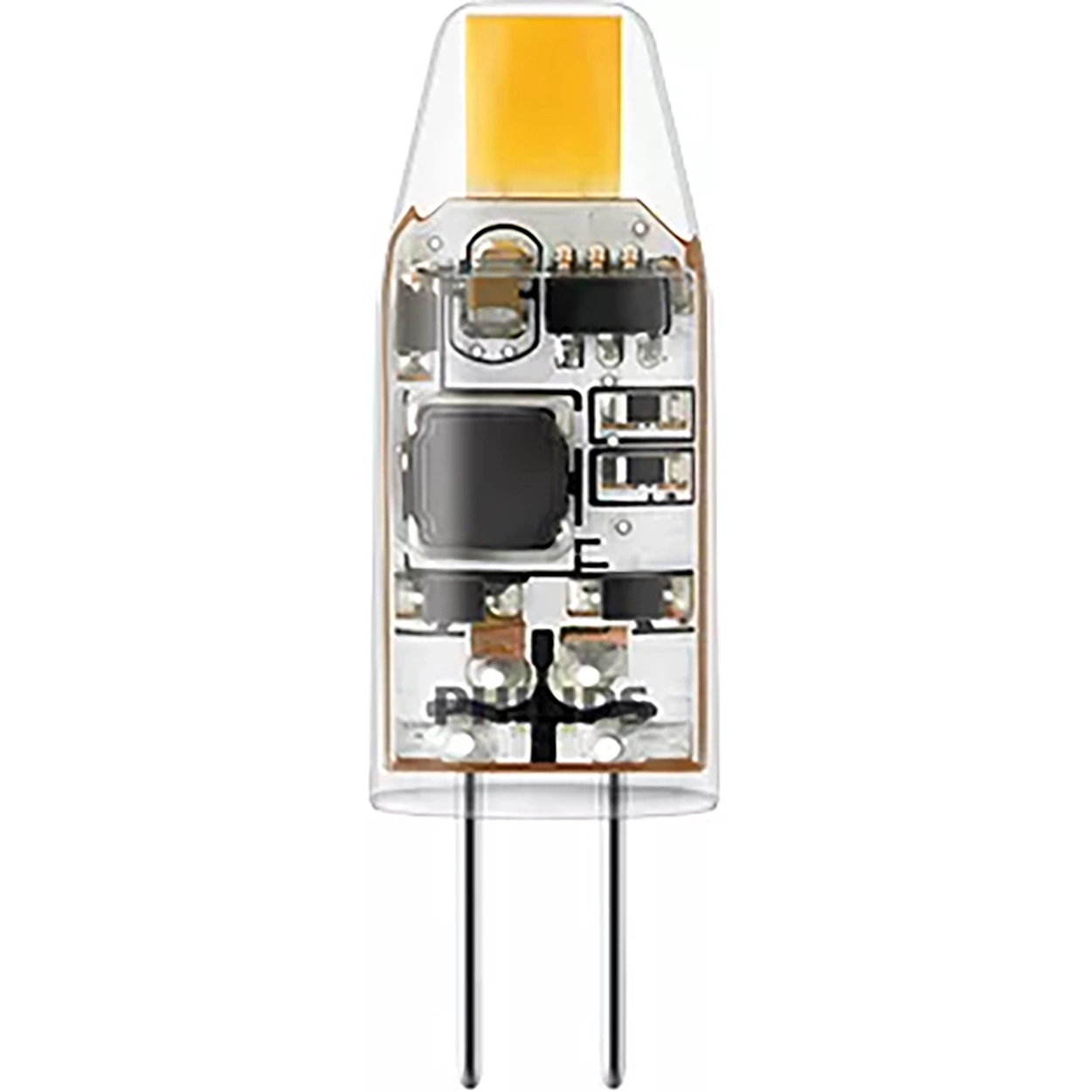 Entdecken Sie die außergewöhnliche Lichtqualität der G4-LED-Glühlampen von Philips! Diese äußerst sparsamen Lichtquellen bieten eine Leistung, die einer herkömmlichen 10W-Glühbirne entspricht, und verbrauchen dabei nur 1W. Dabei zeichnen sie sich durch eine hohe Lichtausbeute von 100 lm/W aus. Sie strahlen eine warmweiße Lichtfarbe von 2700K aus, die sich perfekt für die Schaffung einer gemütlichen Atmosphäre in Ihrem Zuhause eignet.