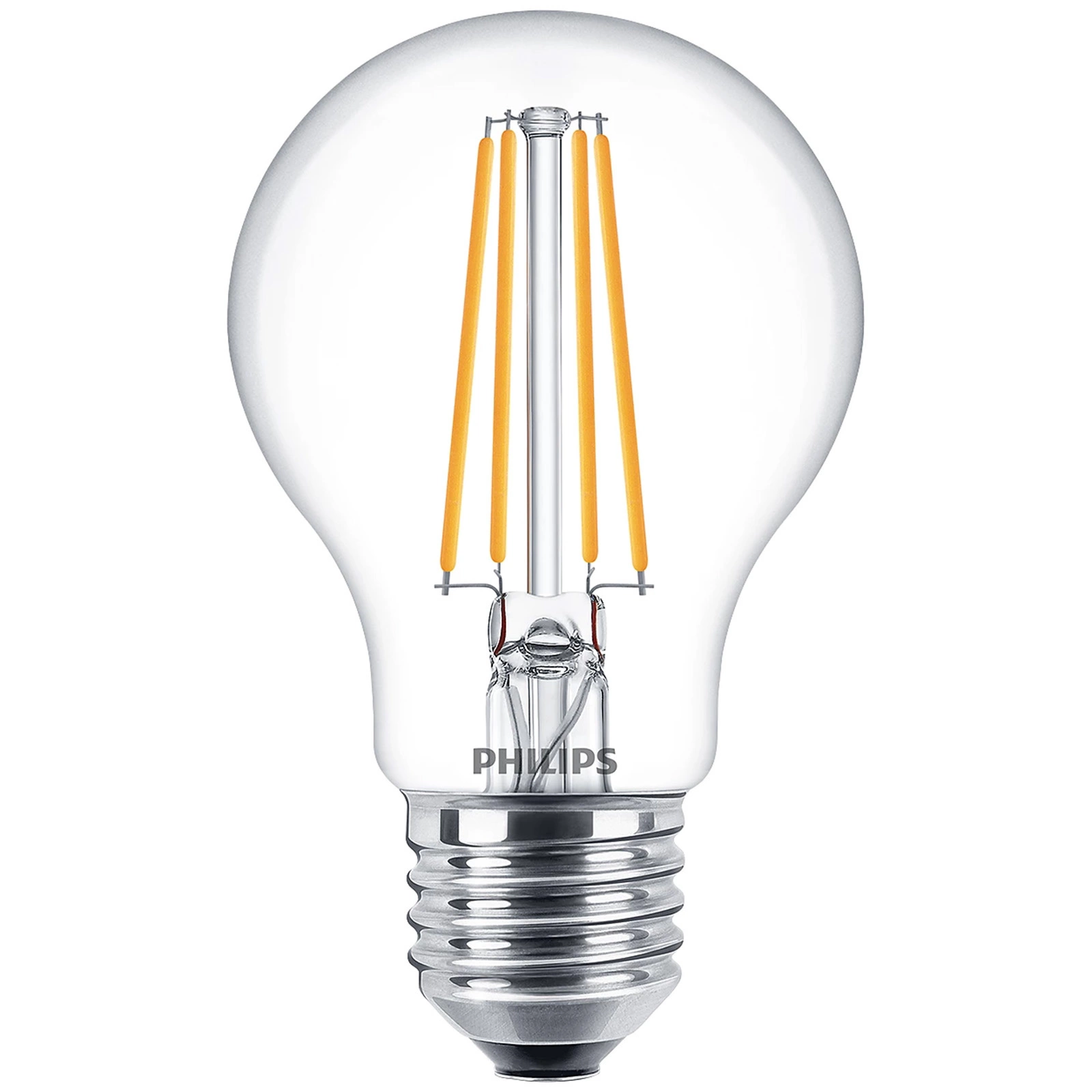 LED Lampen marken PHILIPS 7W, für den täglichen Gebrauch in Innenräumen. Die vertrauten Formen, die Sie lieben. Dank der neuesten energiesparenden LED-Technologie verbrauchen sie etwa 85 % weniger Energie als herkömmliche Glühbirnen und haben eine zehnmal längere Lebenserwartung. Standard-Glühlampe in Klarglas, mit E27-Gewinde, 15.000 Stunden Lebensdauer und einem Lichtstrom von 806 Lumen. Die Lampenleistung entspricht der einer 60-W-Glühlampe.