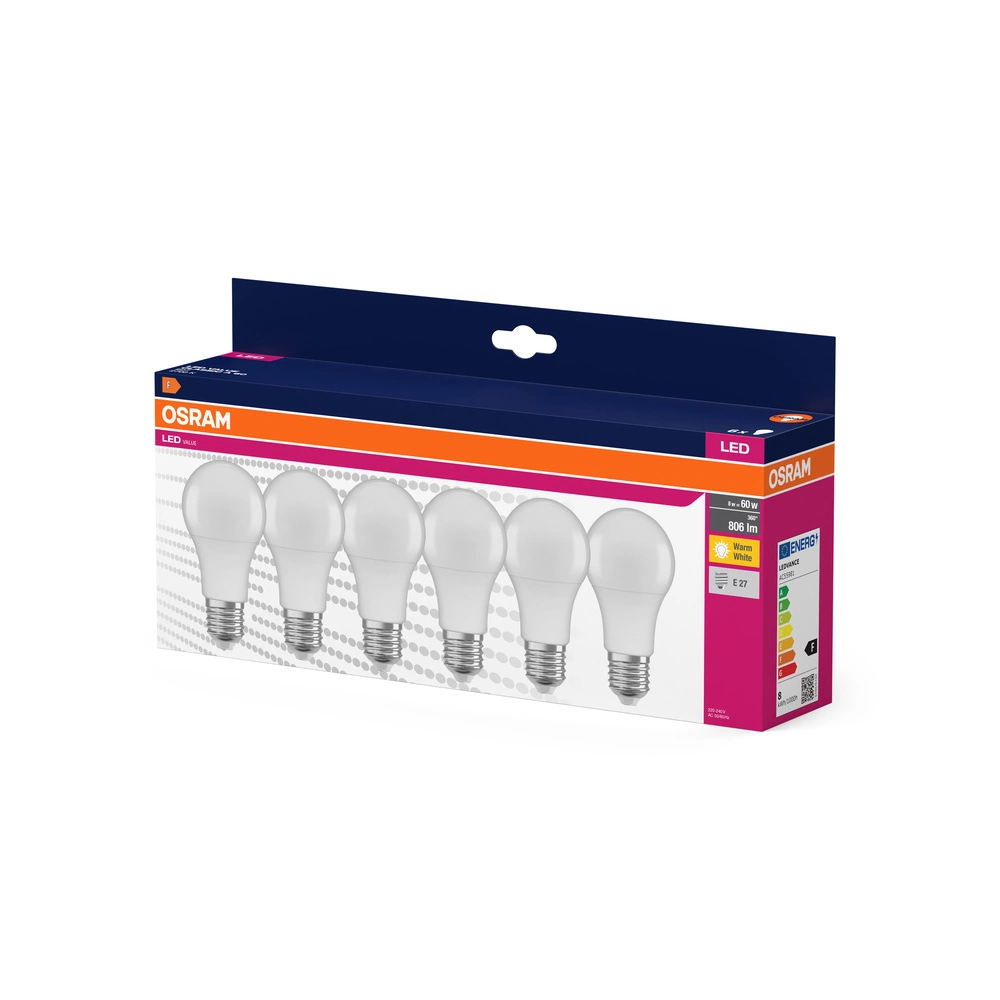Wir stellen Ihnen ein Set von 6 Osram LED-Lampen aus der VALUE CLASSIC-Serie vor, die moderne Technologie und Energiesparen perfekt miteinander verbinden. Jede Glühbirne mit einer Nennleistung von 8W entspricht einer herkömmlichen 60W-Glühbirne und liefert einen Lichtstrom von bis zu 806lm. Mit einer Farbtemperatur von 2700K geben sie ein warmweißes Licht ab, das in jedem Raum eine gemütliche Atmosphäre schafft. Sie zeichnen sich durch eine hohe Lichtausbeute von 101 lm/W aus, was sie zu einer ausgezeichneten Wahl für alle macht, die auf energieeffiziente Lösungen in ihrem Zuhause Wert legen.
