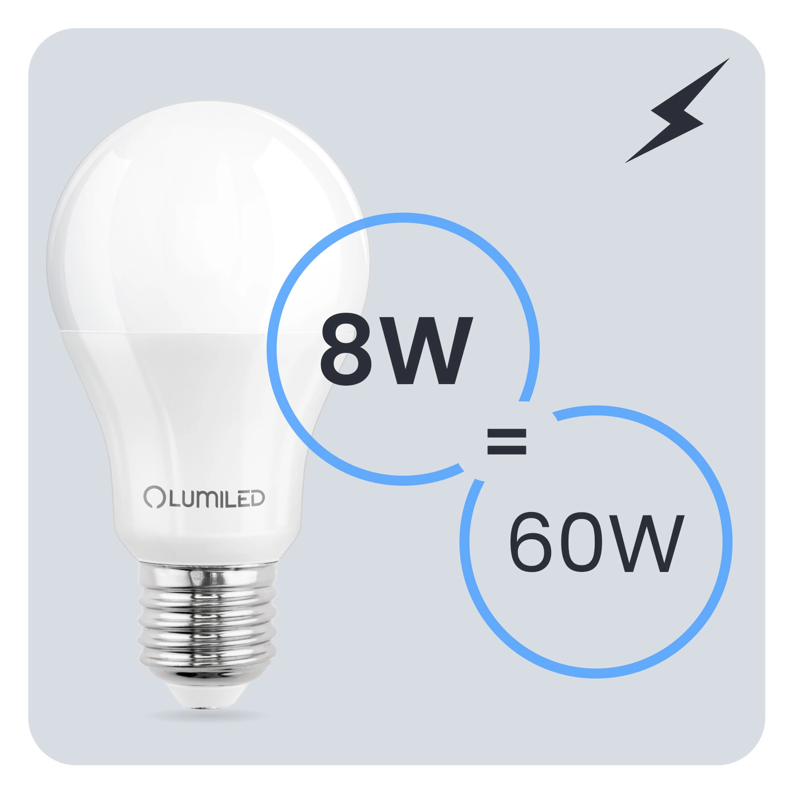 Dieser Satz von 6x LED-Glühbirnen der renommierten Marke LUMILED mit E27-Sockel und 8W ist ein hervorragender Ersatz für herkömmliche 60W-Glühbirnen und bietet Energieeinsparungen und eine längere Lebensdauer. Sie emittiert Licht mit einem Lichtstrom von 806 Lumen und einer neutralen Farbe von 4000K, was sie ideal für die Innenbeleuchtung macht, wo eine helle und natürliche Lichtfarbe erforderlich ist. Der Abstrahlwinkel von 260° ermöglicht eine breite Streuung des Lichts, wodurch der Raum effektiv beleuchtet wird. Dank ihrer hochwertigen Konstruktion hat sie eine Lebensdauer von bis zu 15.000 Stunden, was einer langjährigen Nutzung entspricht. Darüber hinaus kann sie in einem breiten Spannungsbereich von 165-265 V betrieben werden und ist für Umgebungstemperaturen von -20°C bis +40°C geeignet. Eine ideale Wahl für alle, die Wert auf Energieeinsparung und Umweltschutz legen.