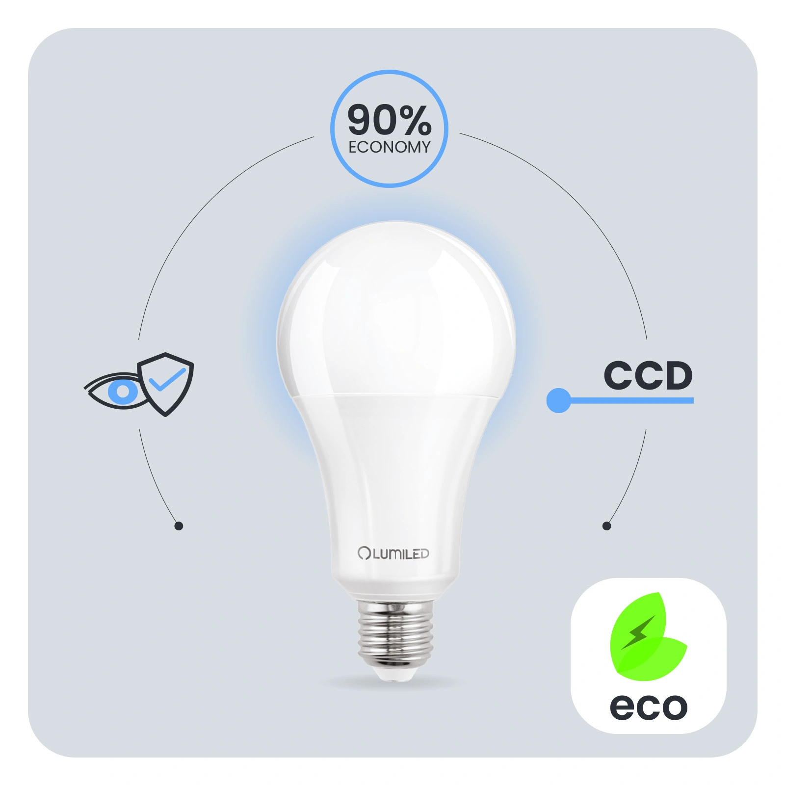 Der in der LED-Glühbirne verwendete CCD-Inverter macht die Glühbirne widerstandsfähig gegen Einbrüche und Spitzen in der Netzspannung. Das Licht flackert und zittert nicht. Der CCD-Konverter sorgt dafür, dass die Glühbirne über einen langen Zeitraum hinweg einwandfrei funktioniert. Bei der Entwicklung der LUMILED-Glühbirnen wurde an den Benutzer gedacht. Eine schlechte Beleuchtungsqualität kann zur Ermüdung der Augen führen. Deshalb verfügen unsere Lampen über die technische Entwicklung Eye Safe, um in jedem Raum eine angenehme und augenfreundliche Beleuchtung zu gewährleisten.