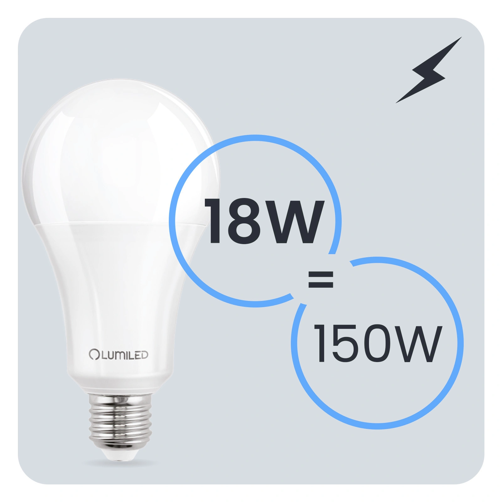Dieser Satz von 6x LED-Glühbirnen der renommierten Marke LUMILED mit E27-Sockel und 18W ist ein hervorragender Ersatz für traditionelle 150W-Glühbirnen und bietet Energieeinsparungen und eine längere Lebensdauer. Sie emittiert Licht mit einem Lichtstrom von 2421 Lumen und einer kalten Lichtfarbe von 6500K, was sie ideal für die Innenbeleuchtung macht, wo eine starke weiße Lichtfarbe erforderlich ist. Der Abstrahlwinkel von 260° ermöglicht eine breite Streuung des Lichts, wodurch der Raum effektiv beleuchtet wird. Dank ihrer hochwertigen Konstruktion hat sie eine Lebensdauer von bis zu 15.000 Stunden, was einer langjährigen Nutzung entspricht. Darüber hinaus kann sie in einem breiten Spannungsbereich von 165-265 V betrieben werden und ist für Umgebungstemperaturen von -20°C bis +40°C geeignet. Eine ideale Wahl für alle, die Wert auf Energieeinsparung und Umweltschutz legen.