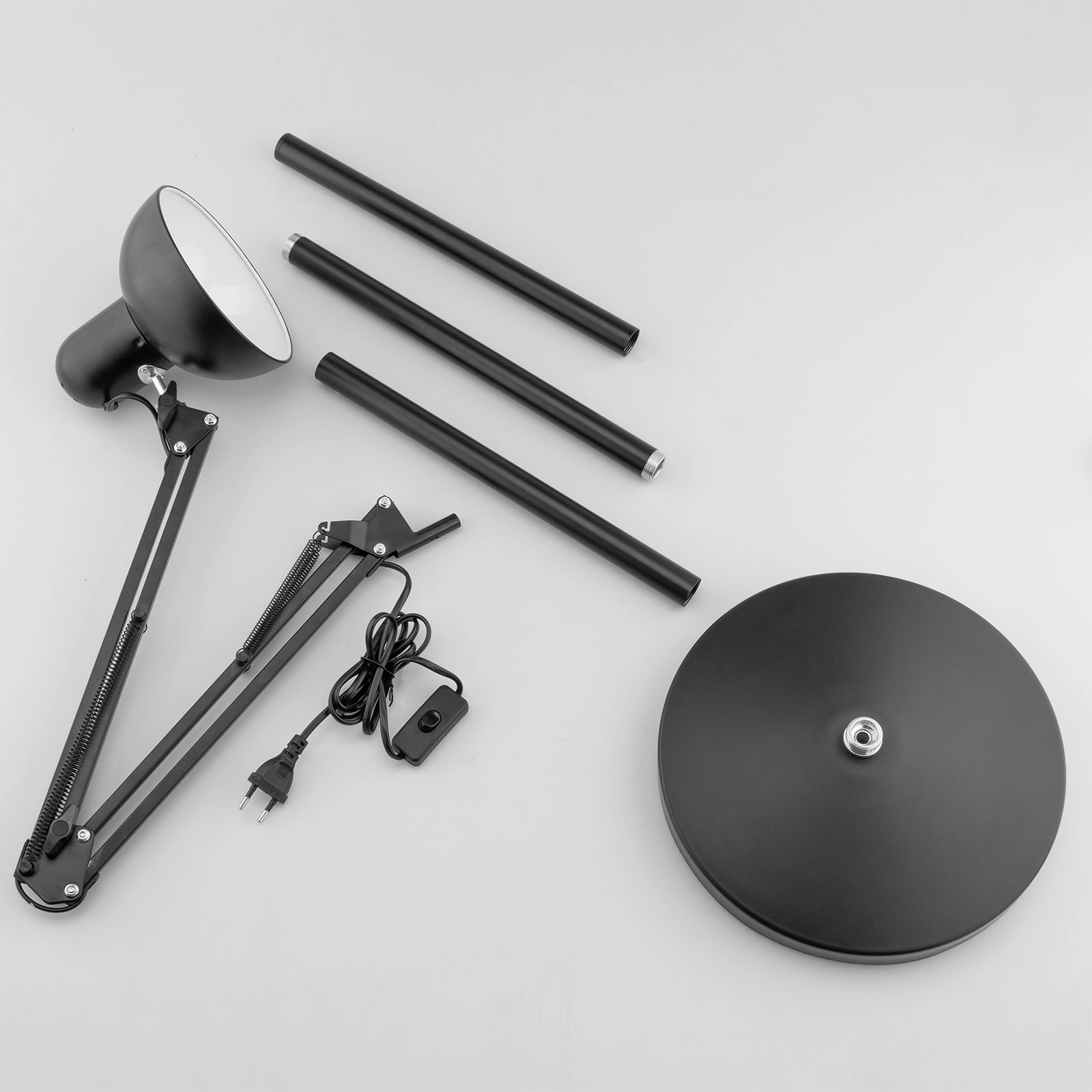 Die Leuchte verfügt über ein innovatives Verlängerungssystem, das eine Höhenverstellung auf vier verschiedenen Ebenen ermöglicht, anpassung an die individuellen Bedürfnisse des Nutzers. Jedes Verlängerungsrohr ist mit einem eingebauten Gewinde versehen, so dass die Komponenten ohne zusätzliches Werkzeug einfach und stabil zusammengeschraubt werden können. Das macht die Montage und Demontage der Lampe schnell und bequem. In Situationen, in denen eine kompaktere Form erforderlich ist, kann das Bein der Leuchte zu einer funktionalen Schreibtischleuchte verkürzt werden. Dieses System macht die Lampe extrem vielseitig und ideal für eine Vielzahl von Anwendungen.