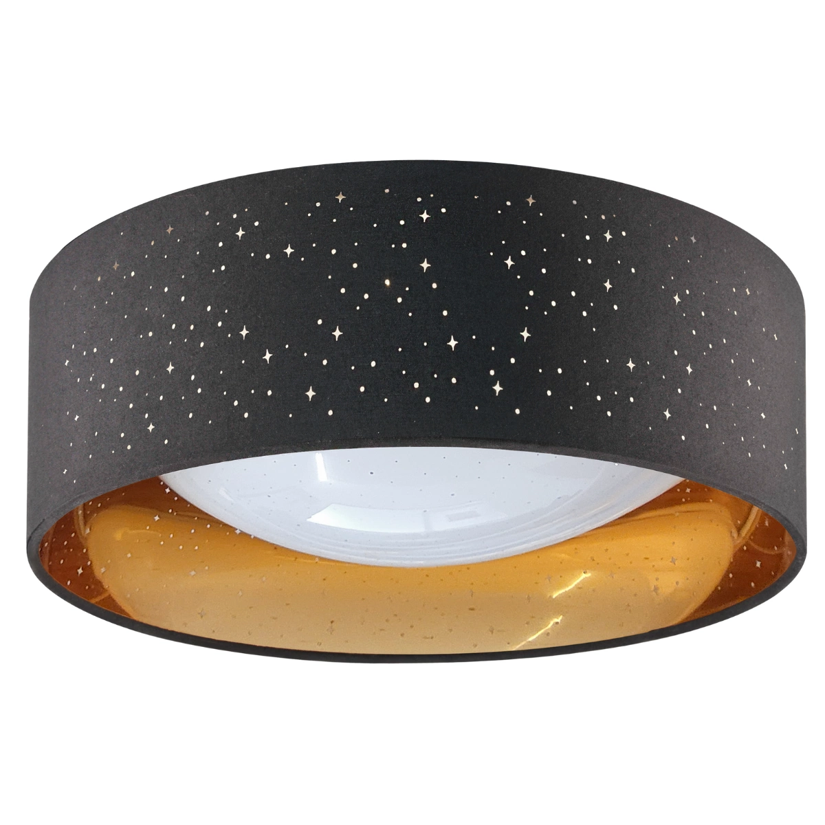 Deckenleuchte Modell Moon ist ein moderner LED-Plafond aus hochwertigen Materialien, der sich durch ein modernes und modisches Design auszeichnet. Schwarzes Äußeres kontrastiert mit goldenem, glänzendem Inneren. Ein zusätzlicher optischer Effekt sind die Löcher im Lampenschirm, die an kleine Sterne erinnern. Die Leuchte verwendet hocheffiziente energiesparende LED-Lichtquellen der Gesamtleistung 18W i neutrale Lichtfarbe (4000K). Die LEDs sind unter einem milchigen, perforierten Diffusor verborgen, der sanfte Reflexionen erzeugt und für eine gleichmäßige Lichtverteilung sorgt, wodurch der negative Effekt der Blendung vermieden wird. Es gibt keinen Spotlight-Effekt oder einen verdunkelten Bereich auf einer Seite (wie bei herkömmlichen Plafonds mit Schraubbirne). Wenn sie eingeschaltet ist, vermittelt die Lampe den Eindruck eines Sternenhimmels. Die robuste und bewährte Konstruktion macht den vorgestellten Plafond nicht nur für Häuser und Wohnungen, sondern auch für Hotels und andere gewerbliche Räume usw. zu einer ausgezeichneten Wahl. Darüber hinaus kann diese leichte Kunststoffleuchte auf fast jeder Oberfläche montiert werden.