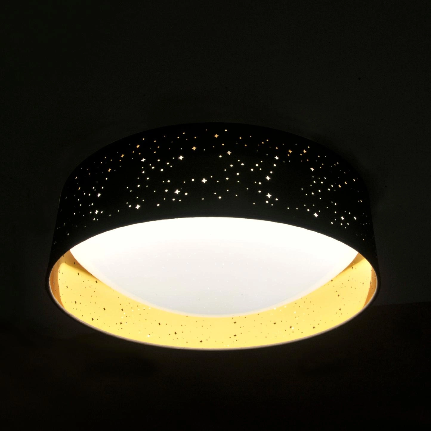 Deckenleuchte Modell Moon ist ein moderner LED-Plafond aus hochwertigen Materialien, der sich durch ein modernes und modisches Design auszeichnet. Schwarzes Äußeres kontrastiert mit goldenem, glänzendem Inneren. Ein zusätzlicher optischer Effekt sind die Löcher im Lampenschirm, die an kleine Sterne erinnern. Die Leuchte verwendet hocheffiziente energiesparende LED-Lichtquellen der Gesamtleistung 24W i neutrale Lichtfarbe (4000K). Die LEDs sind unter einem milchigen, perforierten Diffusor verborgen, der sanfte Reflexionen erzeugt und für eine gleichmäßige Lichtverteilung sorgt, wodurch der negative Effekt der Blendung vermieden wird. Es gibt keinen Spotlight-Effekt oder einen verdunkelten Bereich auf einer Seite (wie bei herkömmlichen Plafonds mit Schraubbirne). Wenn sie eingeschaltet ist, vermittelt die Lampe den Eindruck eines Sternenhimmels. Die robuste und bewährte Konstruktion macht den vorgestellten Plafond nicht nur für Häuser und Wohnungen, sondern auch für Hotels und andere gewerbliche Räume usw. zu einer ausgezeichneten Wahl. Darüber hinaus kann diese leichte Kunststoffleuchte auf fast jeder Oberfläche montiert werden.
