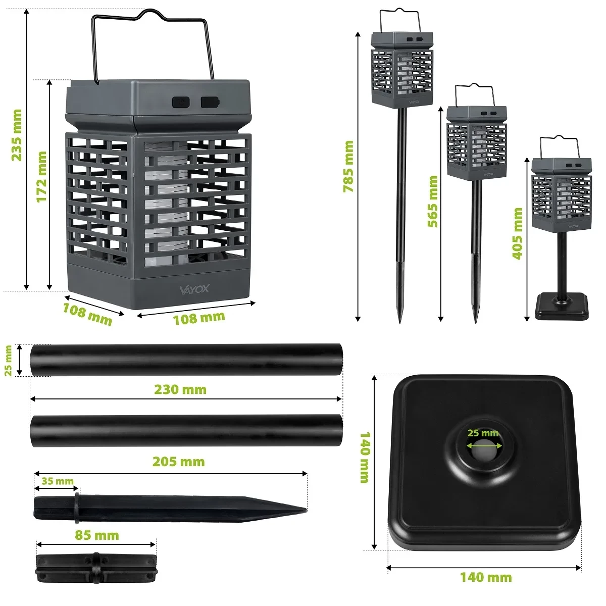 Das Produkt ist äußerst vielseitig, da es sowohl im Freien als auch in Innenräumen aufgestellt werden kann. Die schwarze Farbe verleiht ihr einen Hauch von Eleganz und Stil, während der Dämmerungssensor die Lampe automatisch aktiviert, sobald es dunkel wird. Die VAYOX-Leuchte ist eine zuverlässige Lösung für jeden Raum.