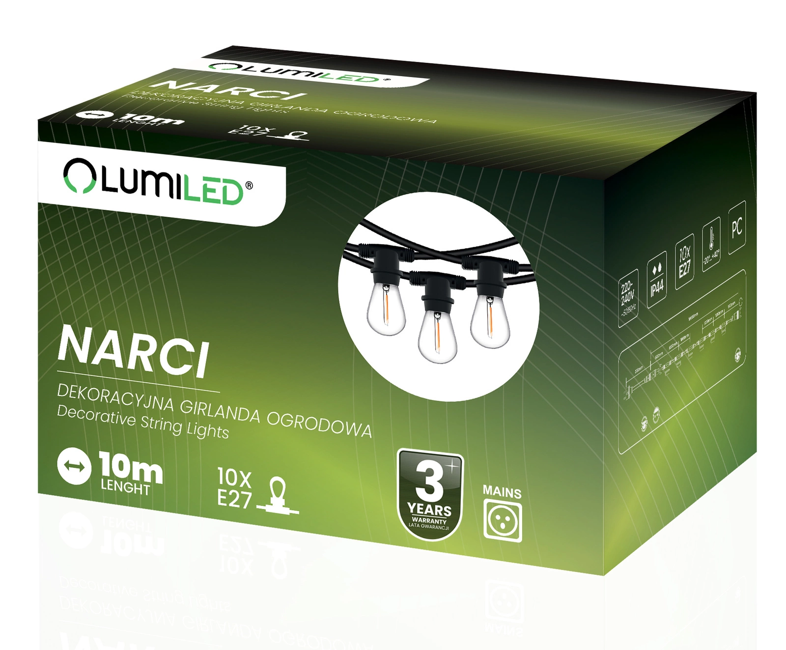 Lichtergirlande, 10 m lange Kette mit LED-Glühbirnen LUMILED in warmen Farben (3000K), alle 100 cm hat ein gängiges E27-Gewinde, so dass Sie die Lichtwirkung selbst bestimmen können. Die Girlande sieht im Garten wunderschön aus und kann auch die Hauptlichtquelle für unsere Gartenlaube sein. Durch die richtige Anordnung der Lichter in der vorgestellten Lichtergirlande wird eine außergewöhnliche Atmosphäre geschaffen, die sich sowohl für Abendveranstaltungen im Freien als auch für alltägliche, ruhige Abende auf der Terrasse eignet.