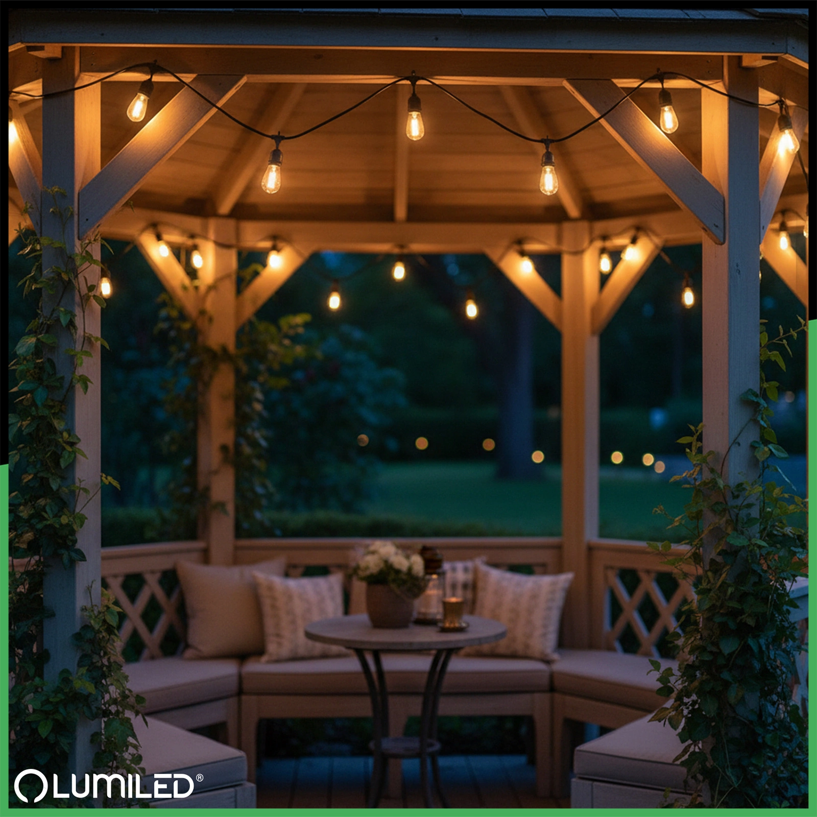 LUMILED-Lichtergirlande ist eine elegante und funktionelle Lösung, die jedem Raum Charme verleiht. Dank seines klassischen Designs fügt er sich perfekt in die Ästhetik des Gartens ein und schafft eine gemütliche Atmosphäre für abendliche Zusammenkünfte im Freien. Sie kann auch die Hauptlichtquelle in der Gartenlaube sein, die sowohl für das Abendessen als auch für entspannende Momente unter freiem Himmel eine angemessene Beleuchtung bietet. Dank der Lichtgirlande erhält jeder Garten oder Pavillon eine neue, magische Dimension und wird zu einem beliebten Ort der Begegnung und Entspannung im Freien.