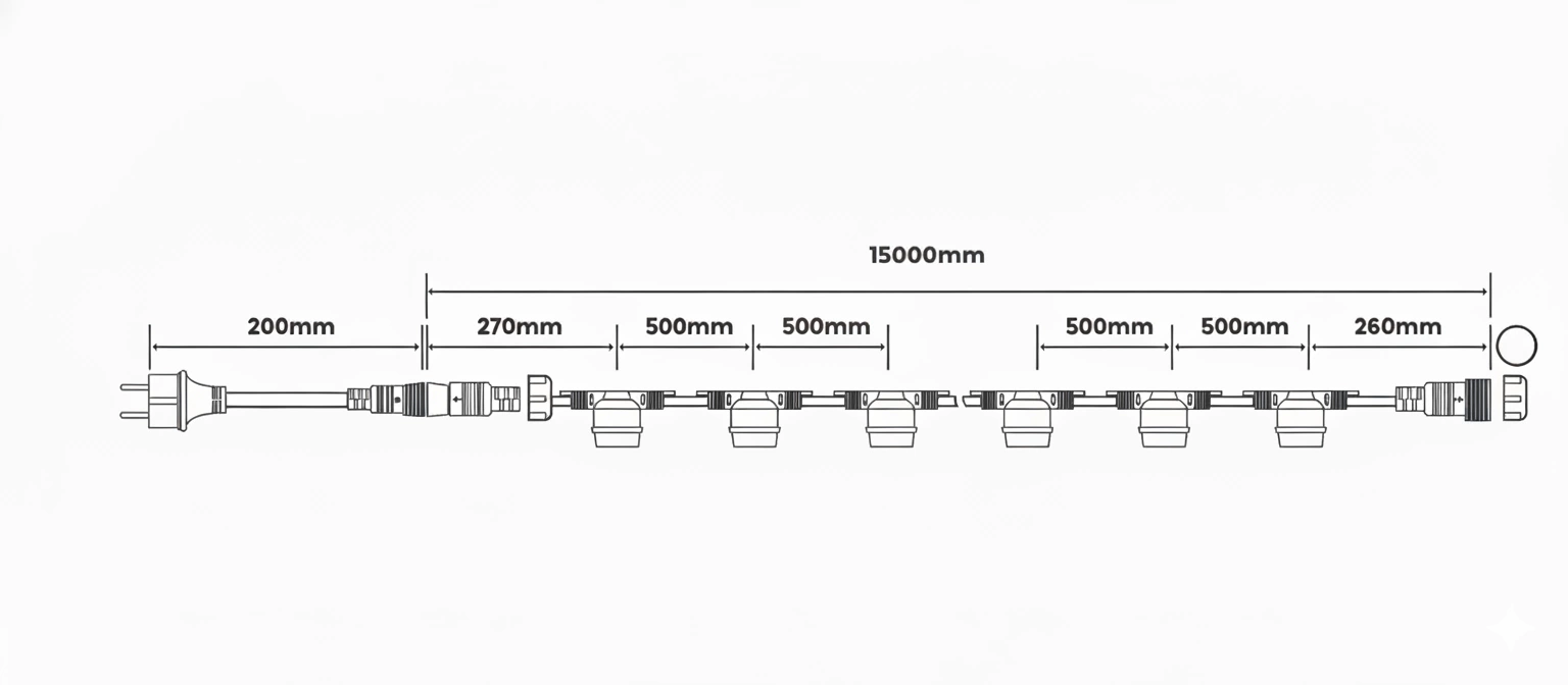 Die Materialien, die bei der Herstellung der Girlande verwendet wurden, gewährleisten die Widerstandsfähigkeit gegen das Eindringen von Staub und Feuchtigkeit, die IP44 ist. Jede Girlandenfassung ist mit einer robusten Dichtung versehen.