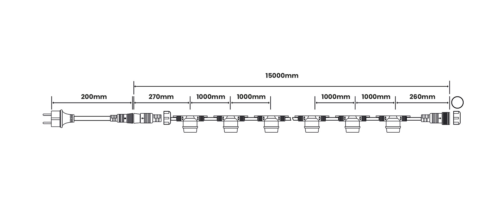 Die Materialien, die bei der Herstellung der Girlande verwendet wurden, gewährleisten die Widerstandsfähigkeit gegen das Eindringen von Staub und Feuchtigkeit, die IP44 ist. Jede Girlandenfassung ist mit einer robusten Dichtung versehen.