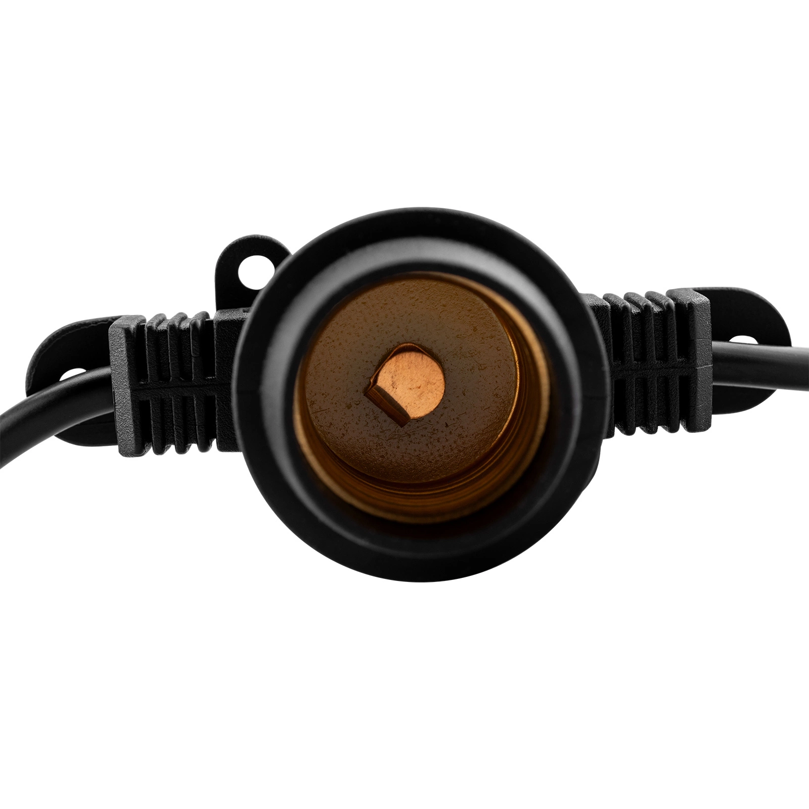 Der robuste und wetterfeste Stiel der Gartengirlande ermöglicht die Installation von E27-Glühbirnen für eine zuverlässige und dekorative Beleuchtung. Die robuste Kabelisolierung sorgt für Sicherheit beim Einsatz im Freien und schützt die Installation vor Feuchtigkeit und mechanischen Beschädigungen. Sie ist die perfekte Lösung für Gärten, Terrassen, Balkone, aber auch für gewerbliche Räume wie Restaurants oder Cafés.