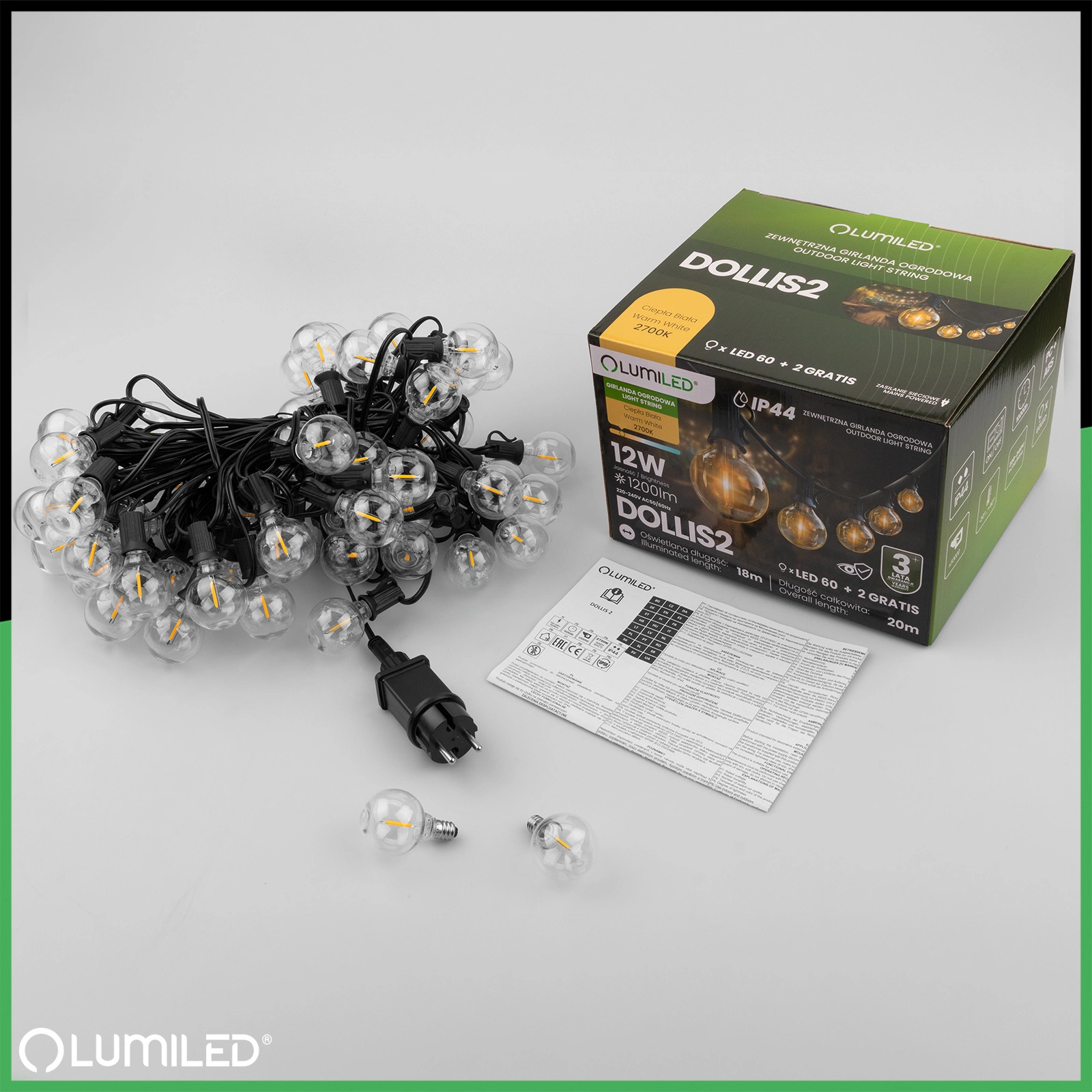 Die 20 Meter lange Gartengirlande DOLLIS2 von LUMILED ist die perfekte Lösung für eine stimmungsvolle Beleuchtung im Garten, auf der Terrasse oder dem Balkon. Ausgestattet mit 60 Lichtpunkten (+ 2 kostenlos), sorgt sie für eine gleichmäßige und effektive Beleuchtung größerer Flächen. Die integrierte Weltlichtquelle strahlt eine warme Farbe von 2700K aus, die eine gemütliche, entspannende Atmosphäre schafft. Dank des Einsatzes moderner LED-Technologie ist die Girlande äußerst energieeffizient.